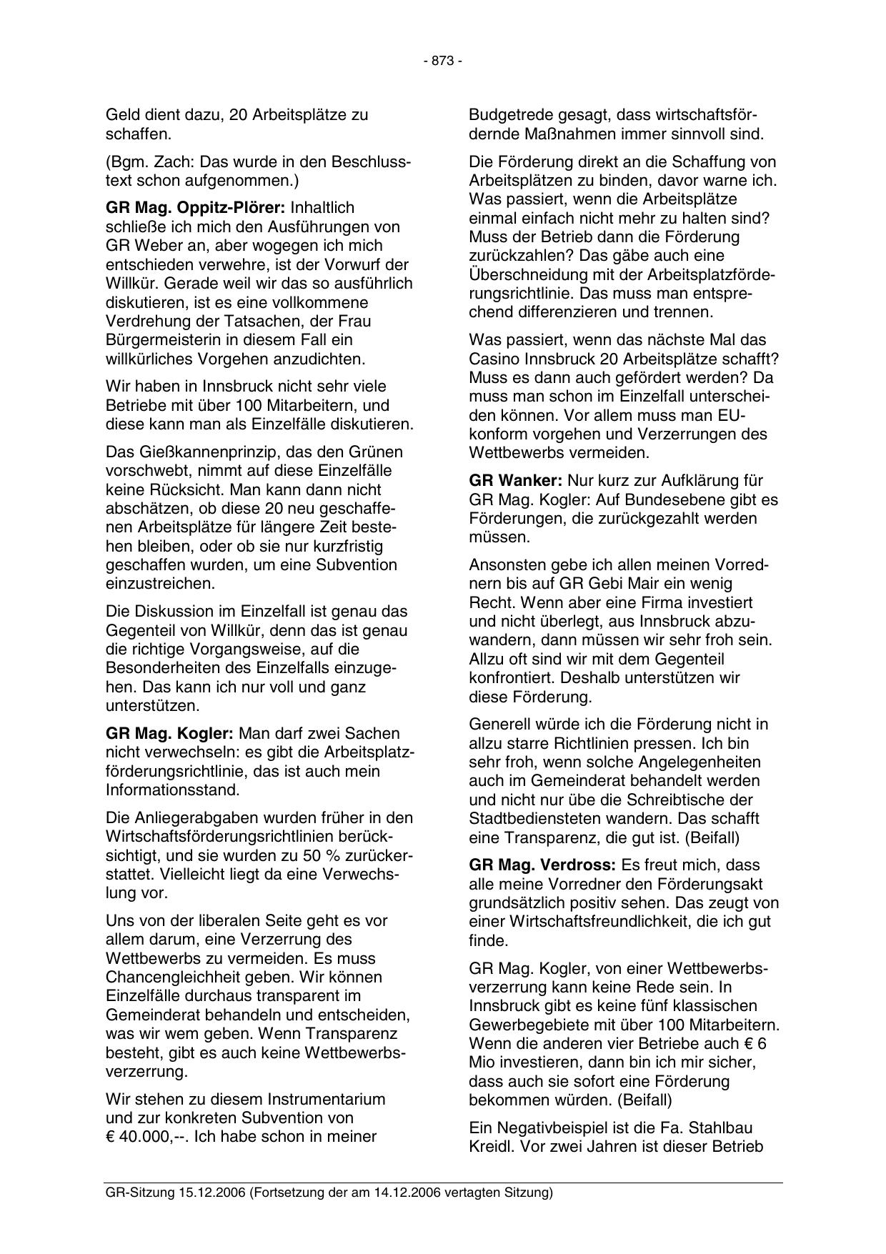 GR-Sitzung 15.12.2006 (Fortsetzung der am 14.12.2006 vertagten Sitzung)