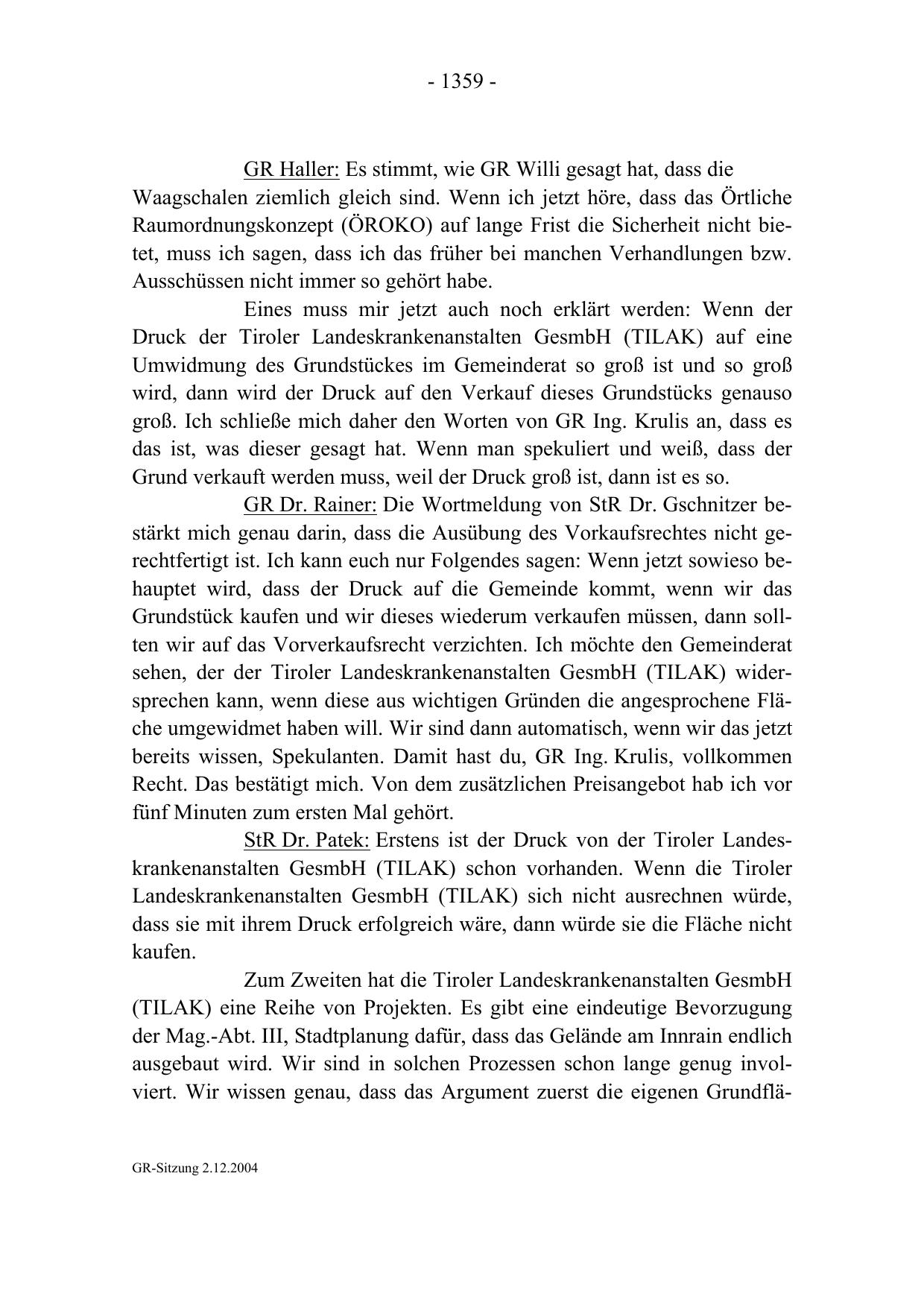 GR Dr. Rainer: Die Wortmeldung von StR Dr. Gschnitzer bestärkt mich genau darin, dass die Ausübung des Vorkaufsrechtes nicht gerechtfertigt ist. Ich kann euch nur Folgendes sagen: Wenn jetzt sowieso behauptet wird, dass der Druck auf die Gemeinde kommt, wenn wir das