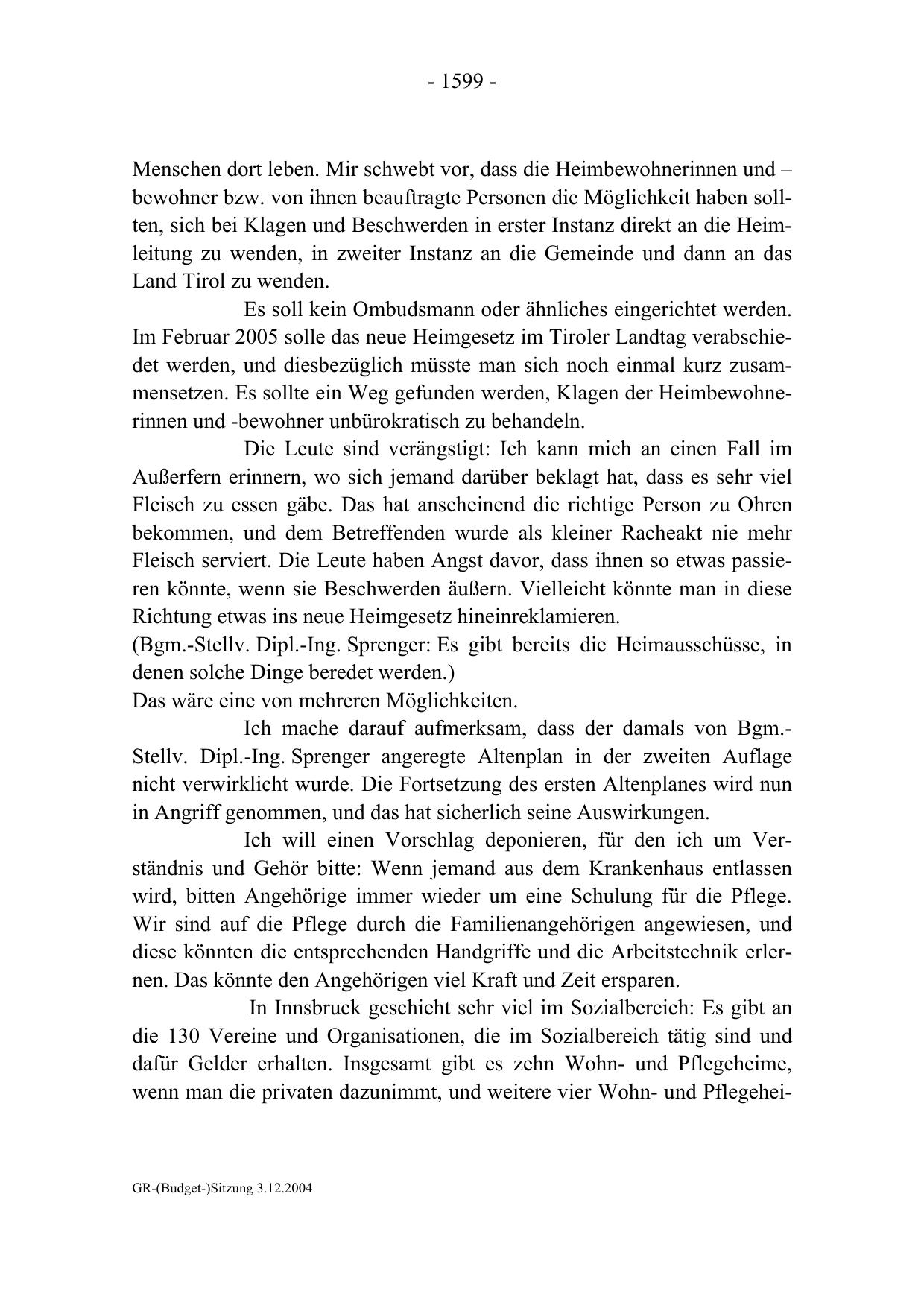 Im Februar 2005 solle das neue Heimgesetz im Tiroler Landtag verabschiedet werden, und diesbezüglich müsste man sich noch einmal kurz zusammensetzen. Es sollte ein Weg gefunden werden, Klagen der Heimbewohnerinnen und -bewohner unbürokratisch zu behandeln.