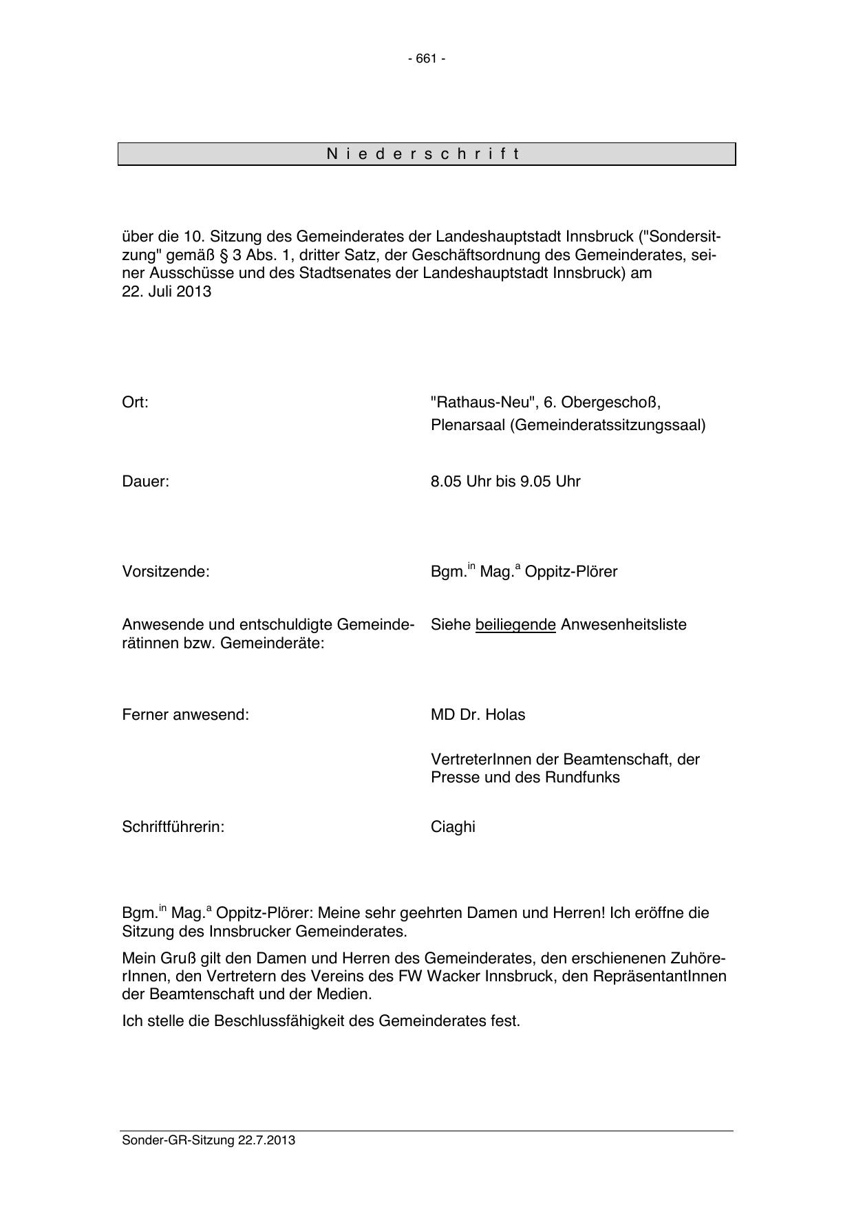 über die 10. Sitzung des Gemeinderates der Landeshauptstadt Innsbruck ("Sondersitzung" gemäß § 3 Abs. 1, dritter Satz, der Geschäftsordnung des Gemeinderates, seiner Ausschüsse und des Stadtsenates der Landeshauptstadt Innsbruck) am