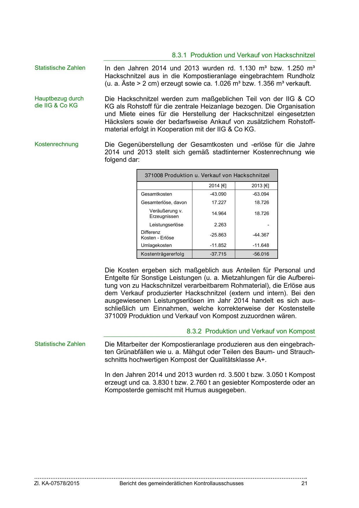 dem Verkauf produzierter Hackschnitzel (extern und intern). Bei den