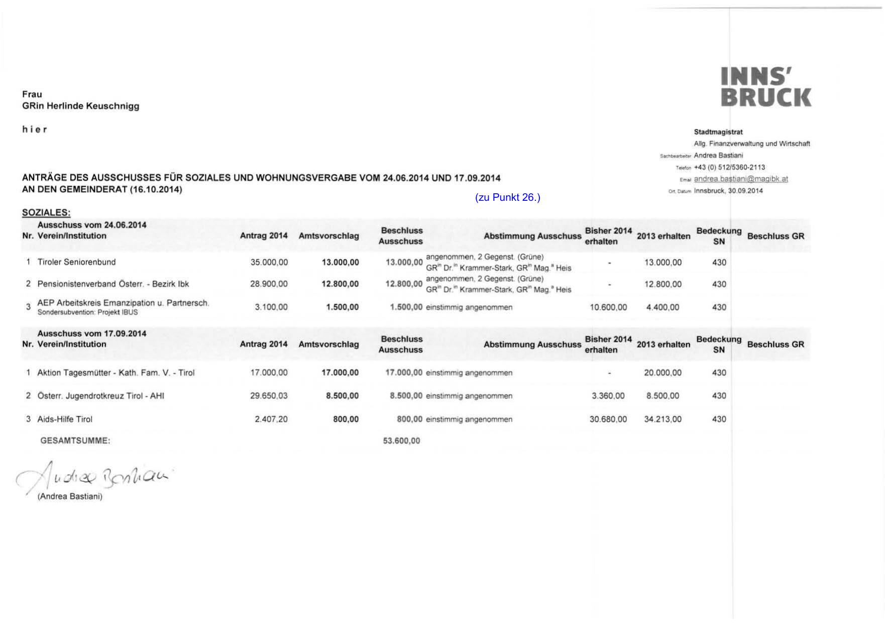 ANTRÄGE DES AUSSCHUSSES FÜR SOZIALES UND WOHNUNGSVERGABE VOM 24.06.2014 UND 17 .09.2014