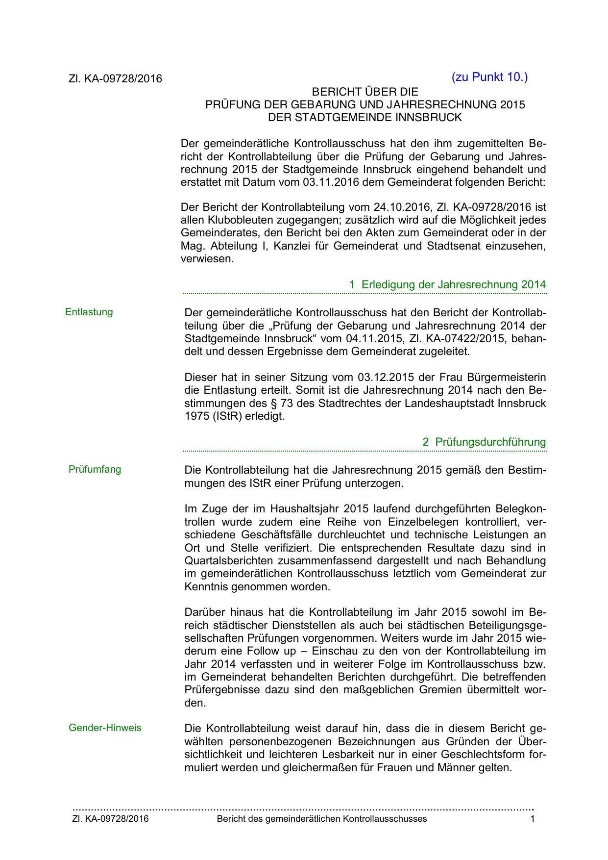 Der gemeinderätliche Kontrollausschuss hat den ihm zugemittelten Bericht der Kontrollabteilung über die Prüfung der Gebarung und Jahresrechnung 2015 der Stadtgemeinde Innsbruck eingehend behandelt und