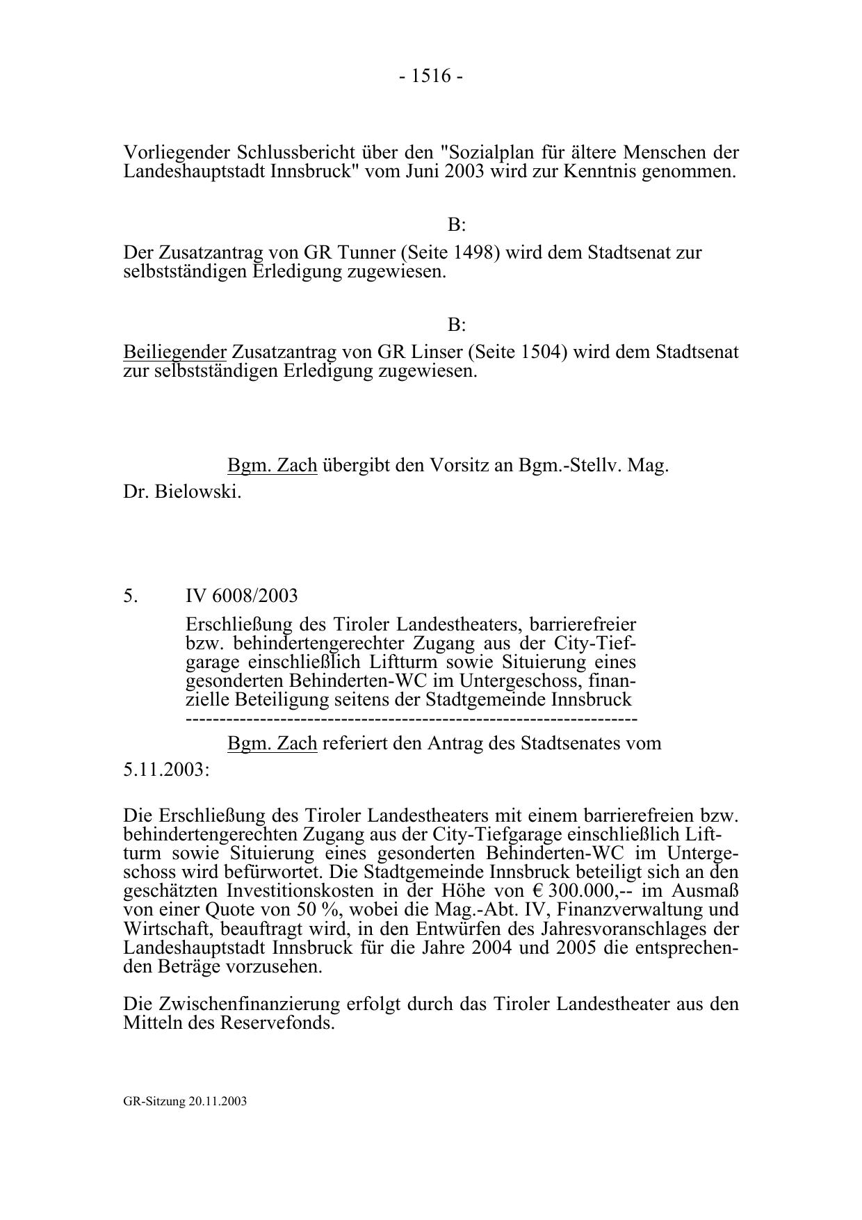 Beiliegender Zusatzantrag von GR Linser (Seite 1504) wird dem Stadtsenat