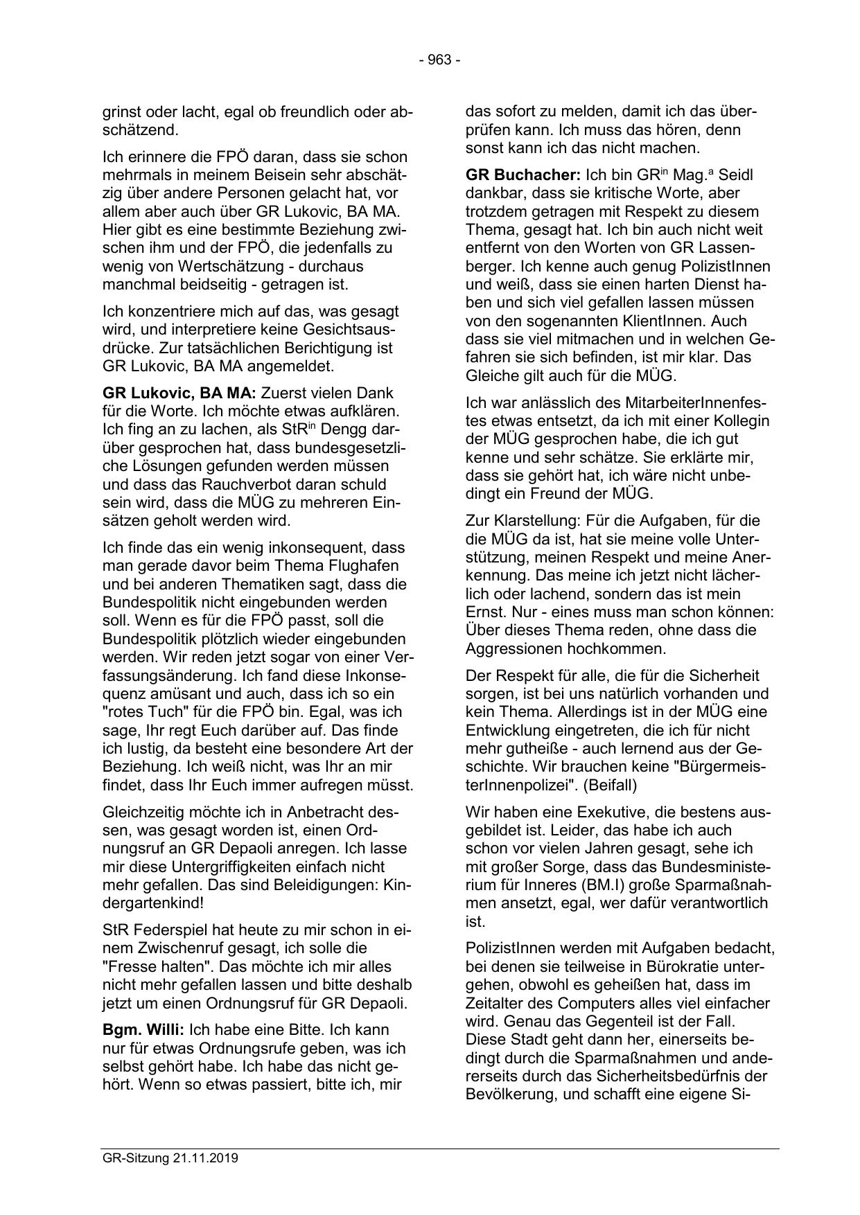 entfernt von den Worten von GR Lassenberger. Ich kenne auch genug PolizistInnen
