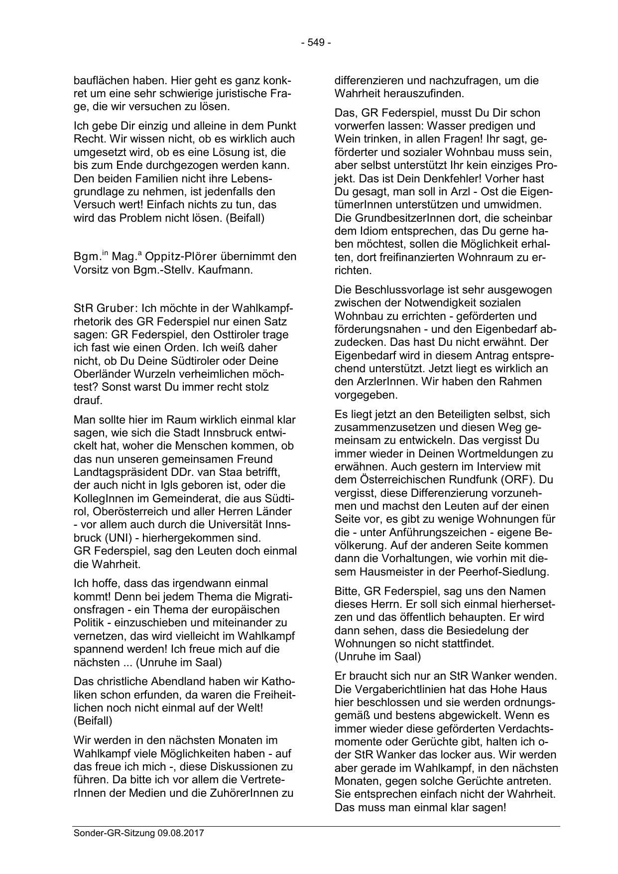 StR Gruber: Ich möchte in der Wahlkampfrhetorik des GR Federspiel nur einen Satz