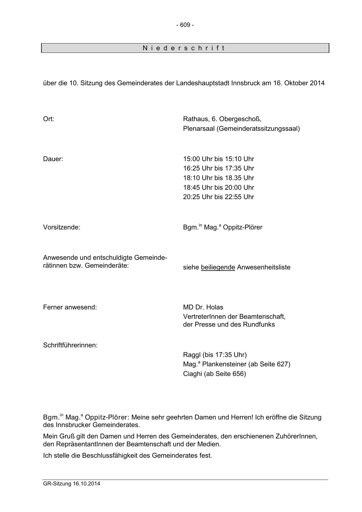 über die 10. Sitzung des Gemeinderates der Landeshauptstadt Innsbruck am 16. Oktober 2014