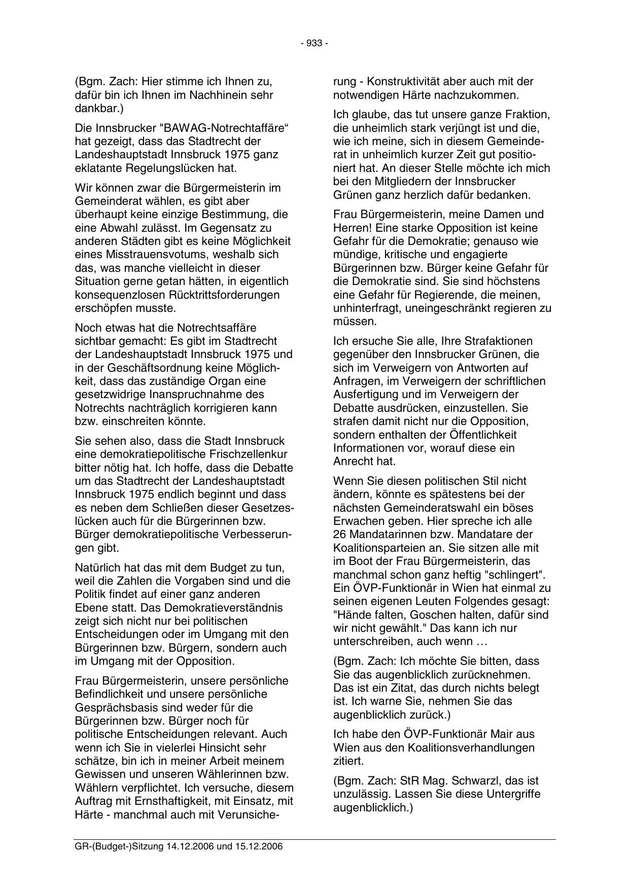 Härte - manchmal auch mit VerunsicheGR-(Budget-)Sitzung 14.12.2006 und 15.12.2006