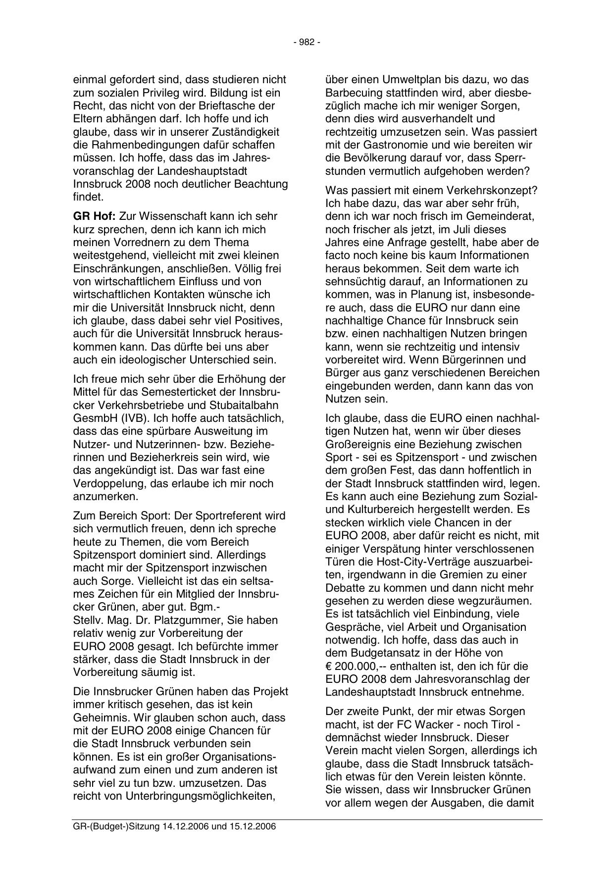 auch Sorge. Vielleicht ist das ein seltsames Zeichen für ein Mitglied der Innsbrucker Grünen, aber gut. Bgm.Stellv. Mag. Dr. Platzgummer, Sie haben