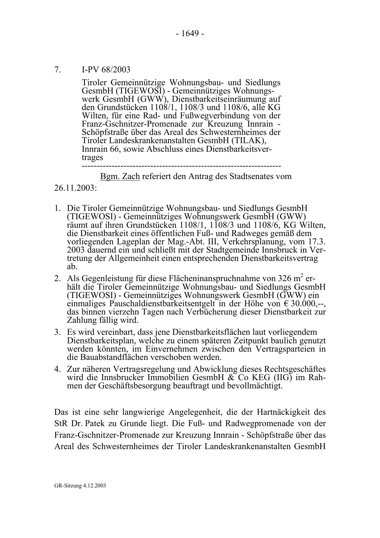 2003 dauernd ein und schließt mit der Stadtgemeinde Innsbruck in Vertretung der Allgemeinheit einen entsprechenden Dienstbarkeitsvertrag