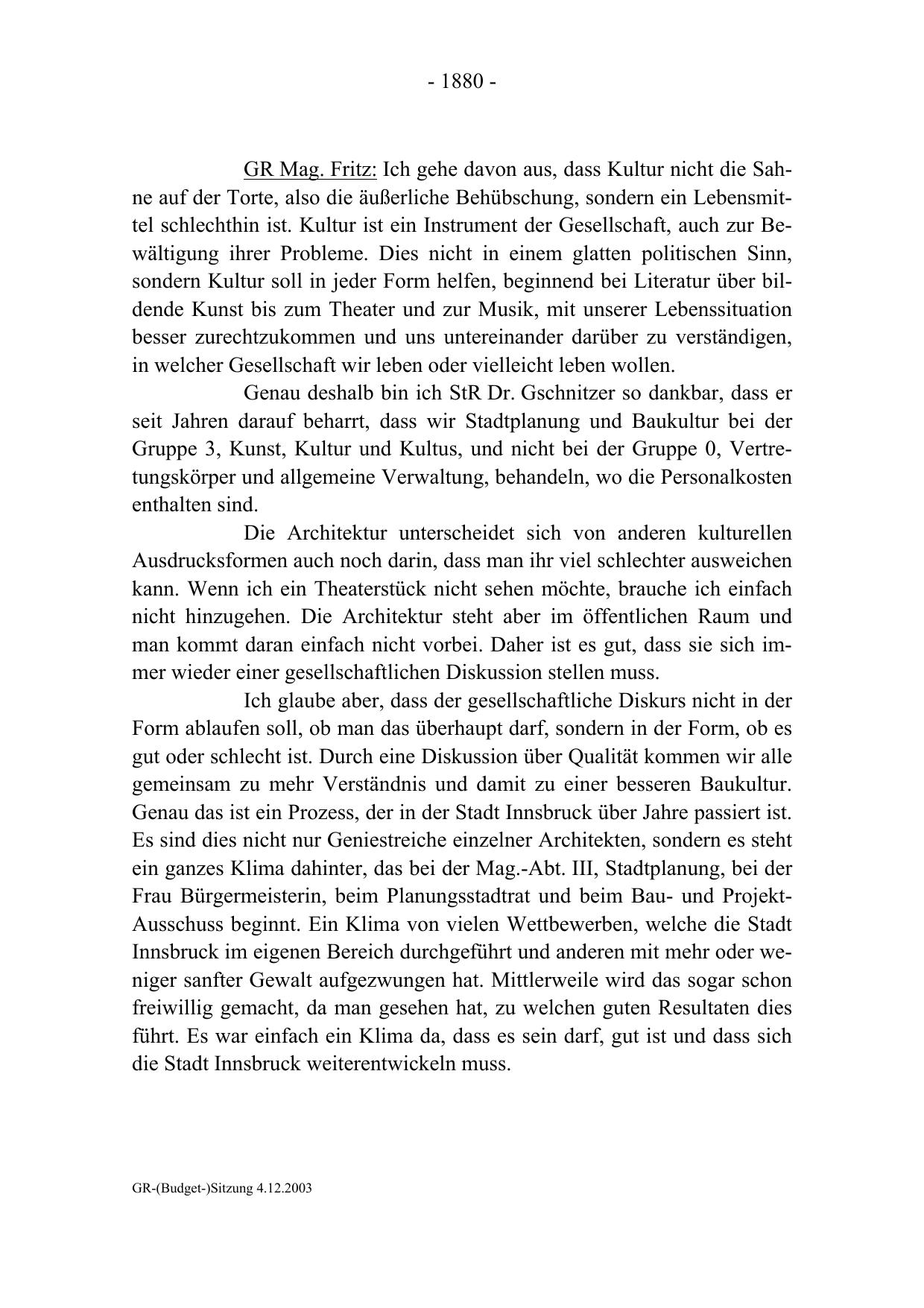 GR Mag. Fritz: Ich gehe davon aus, dass Kultur nicht die Sahne auf der Torte, also die äußerliche Behübschung, sondern ein Lebensmittel schlechthin ist. Kultur ist ein Instrument der Gesellschaft, auch zur Bewältigung ihrer Probleme. Dies nicht in einem glatten politischen Sinn,