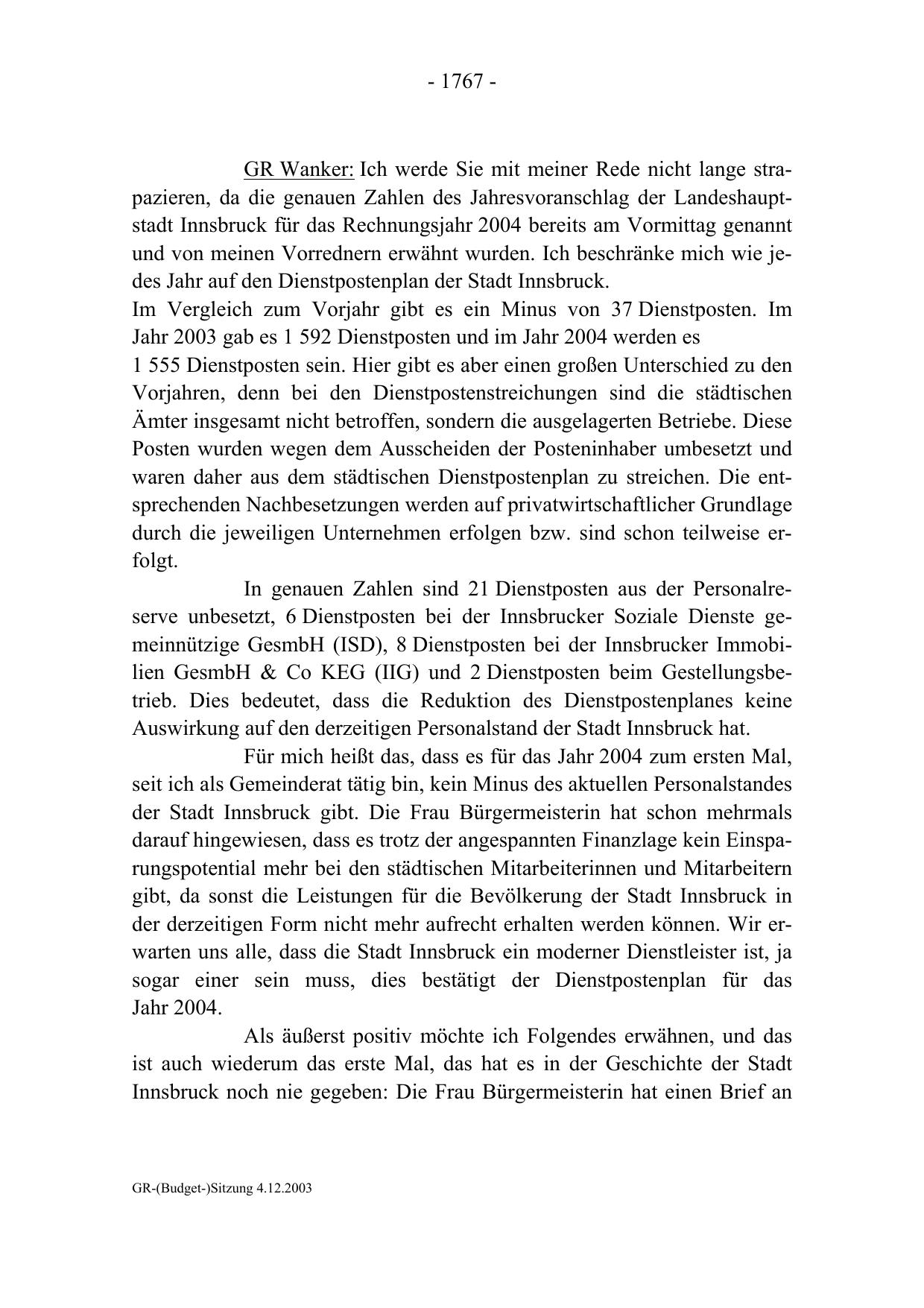 GR Wanker: Ich werde Sie mit meiner Rede nicht lange strapazieren, da die genauen Zahlen des Jahresvoranschlag der Landeshauptstadt Innsbruck für das Rechnungsjahr 2004 bereits am Vormittag genannt