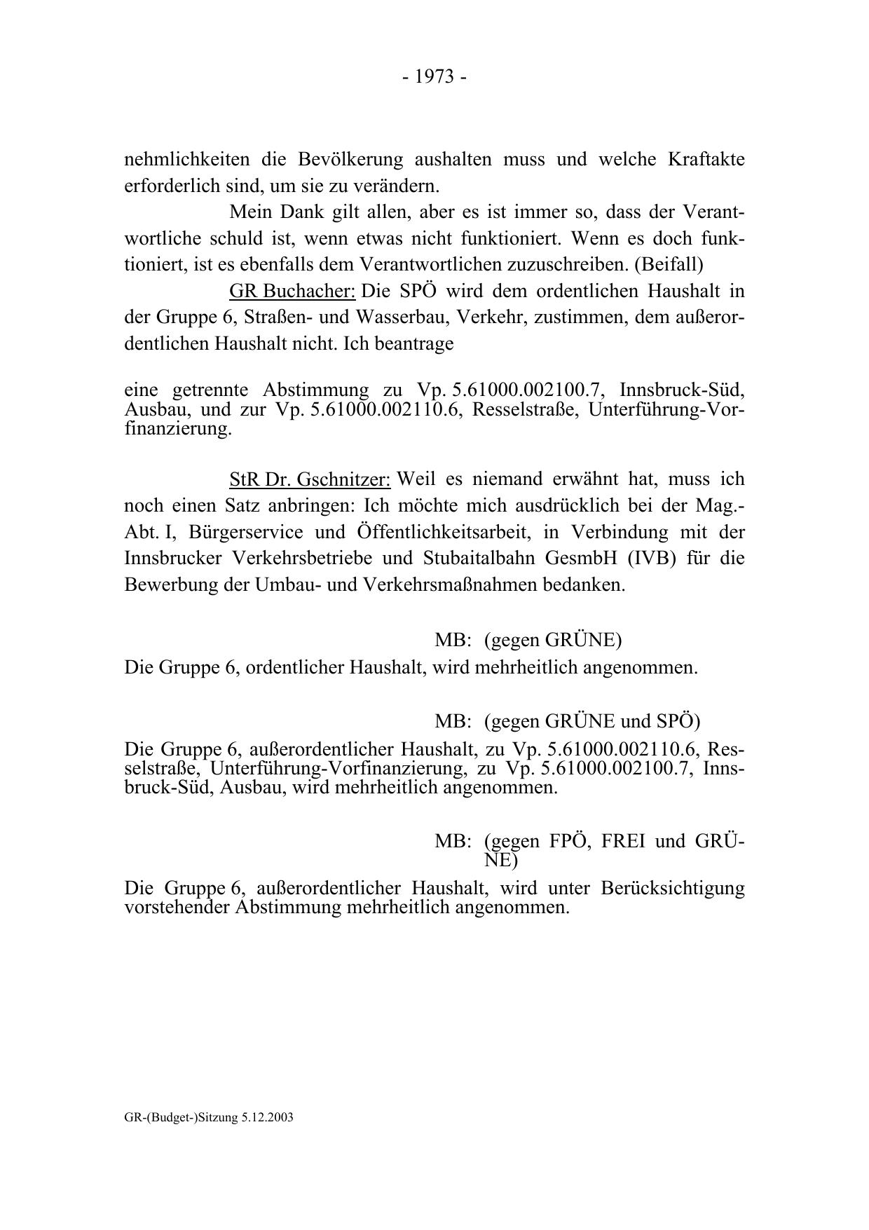 Die Gruppe 6, außerordentlicher Haushalt, zu Vp. 5.61000.002110.6, Resselstraße, Unterführung-Vorfinanzierung, zu Vp. 5.61000.002100.7, Innsbruck-Süd, Ausbau, wird mehrheitlich angenommen.