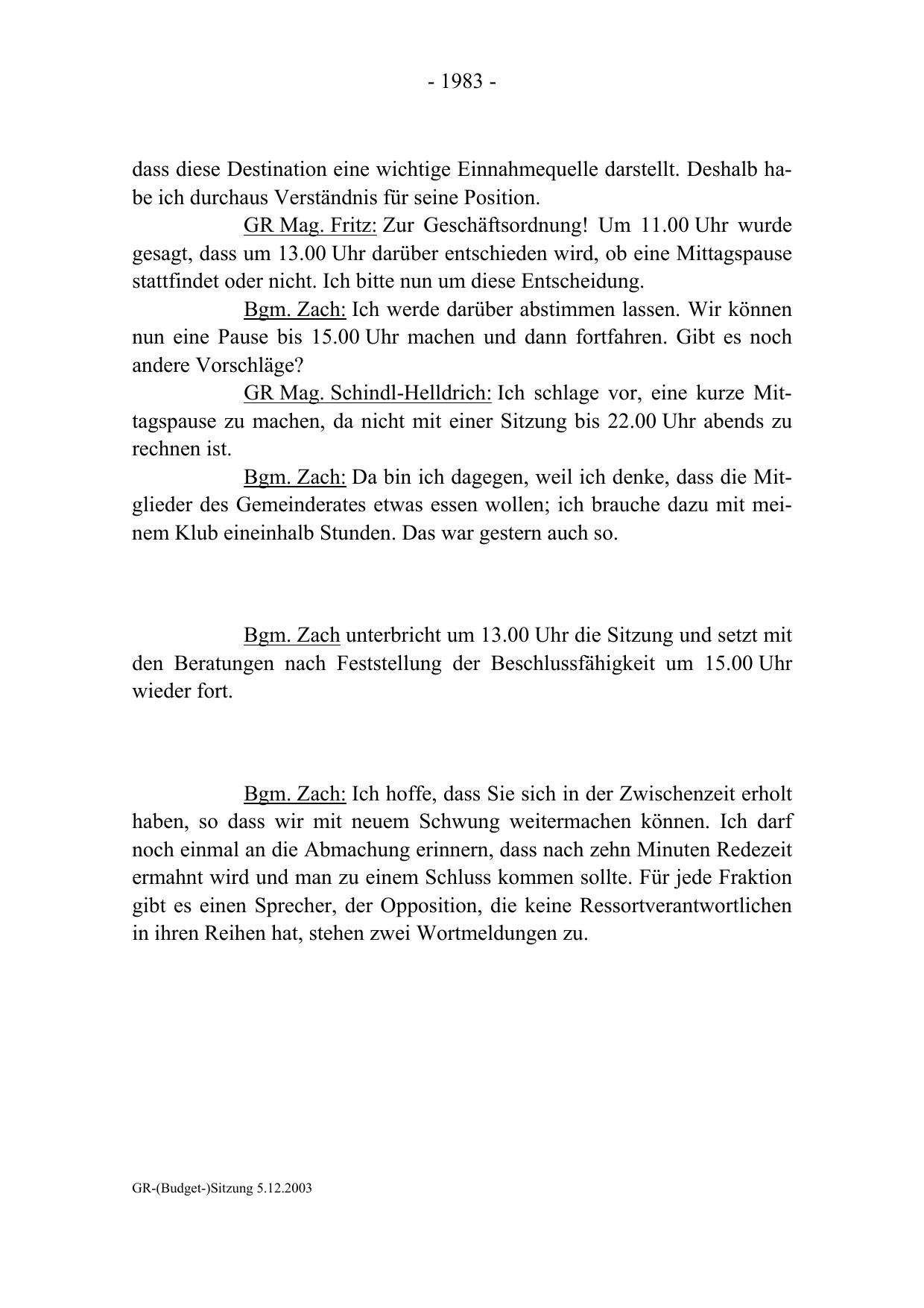 Bgm. Zach: Da bin ich dagegen, weil ich denke, dass die Mitglieder des Gemeinderates etwas essen wollen; ich brauche dazu mit meinem Klub eineinhalb Stunden. Das war gestern auch so.