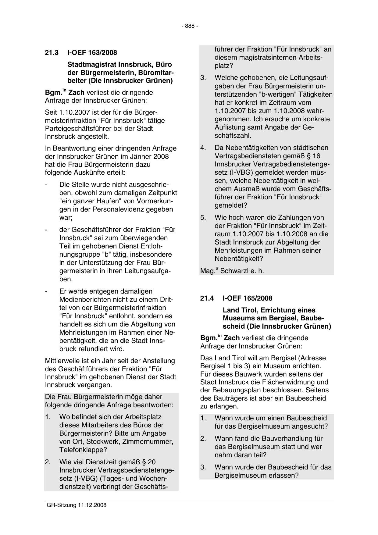 der Fraktion "Für Innsbruck" im Zeitraum 1.10.2007 bis 1.10.2008 an die