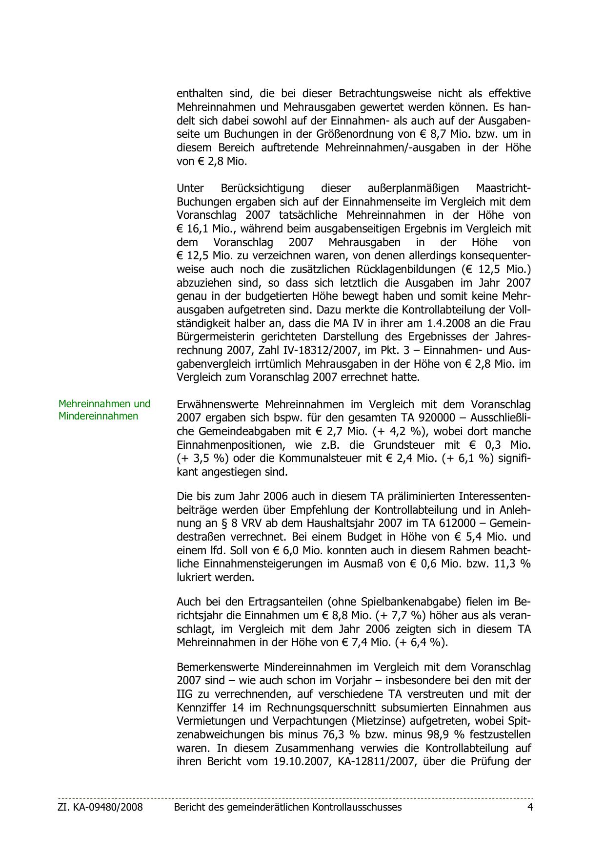 Bürgermeisterin gerichteten Darstellung des Ergebnisses der Jahresrechnung 2007, Zahl IV-18312/2007, im Pkt. 3 – Einnahmen- und Ausgabenvergleich irrtümlich Mehrausgaben in der Höhe von € 2,8 Mio. im