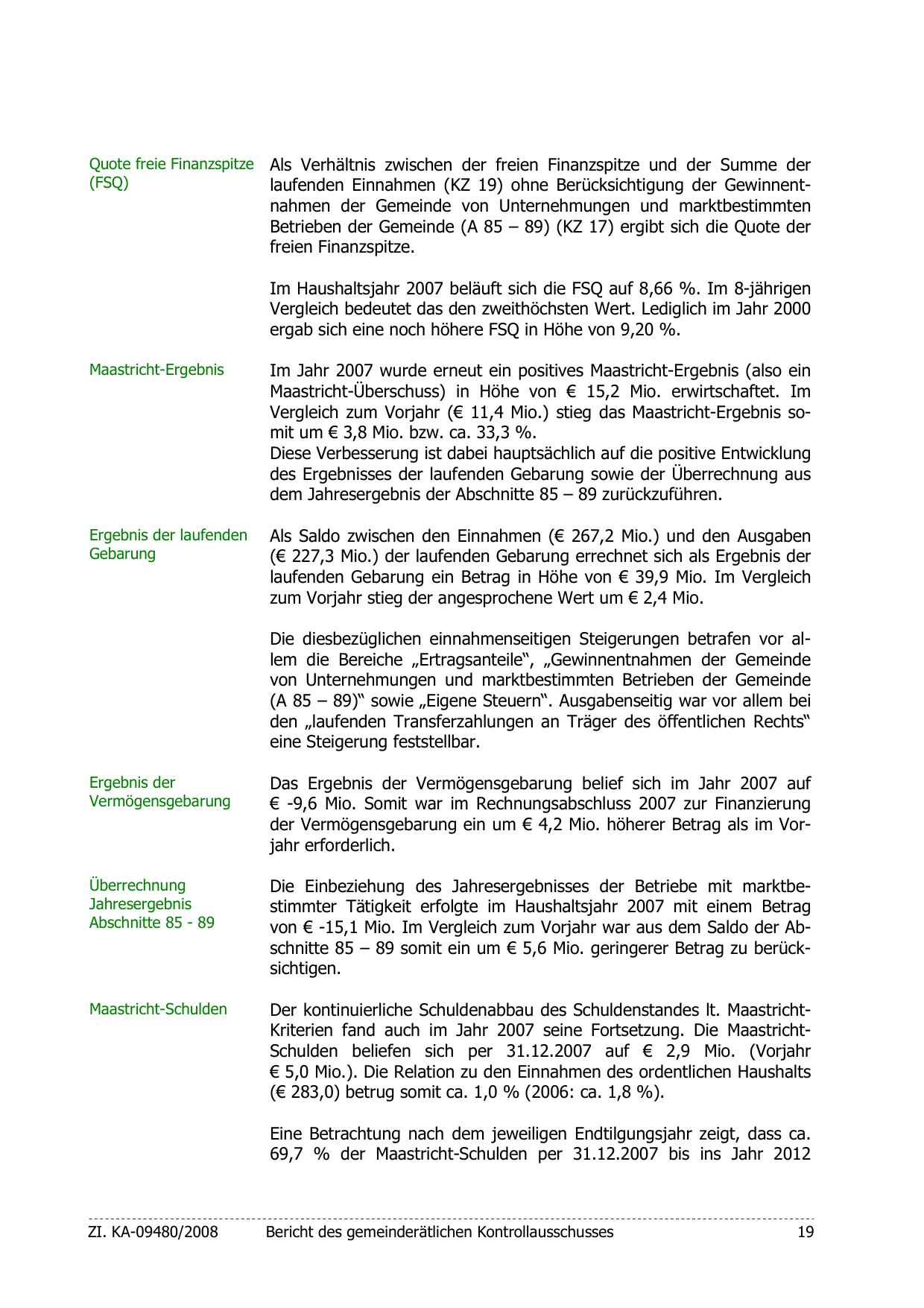 Der kontinuierliche Schuldenabbau des Schuldenstandes lt. MaastrichtKriterien fand auch im Jahr 2007 seine Fortsetzung. Die MaastrichtSchulden beliefen sich per 31.12.2007 auf € 2,9 Mio. (Vorjahr