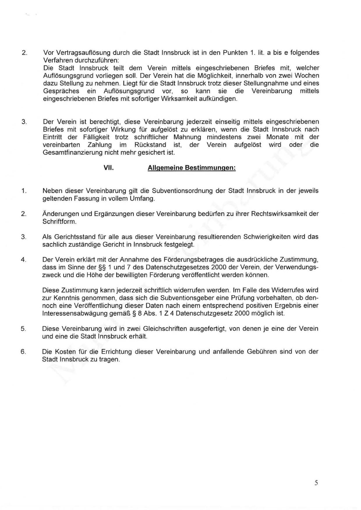 Neben dieser Vereinbarung gilt die Subventionsordnung der Stadt Innsbruck in der jeweils