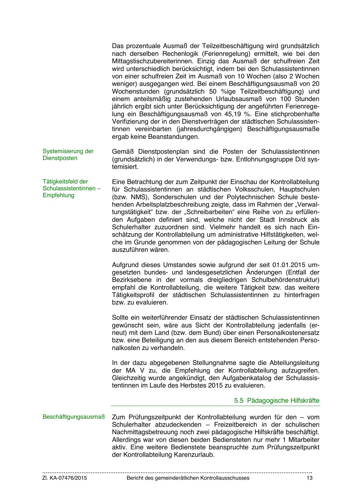 Schulerhalter zuzuordnen sind. Vielmehr handelt es sich nach Einschätzung der Kontrollabteilung um administrative Hilfstätigkeiten, welche im Grunde genommen von der pädagogischen Leitung der Schule