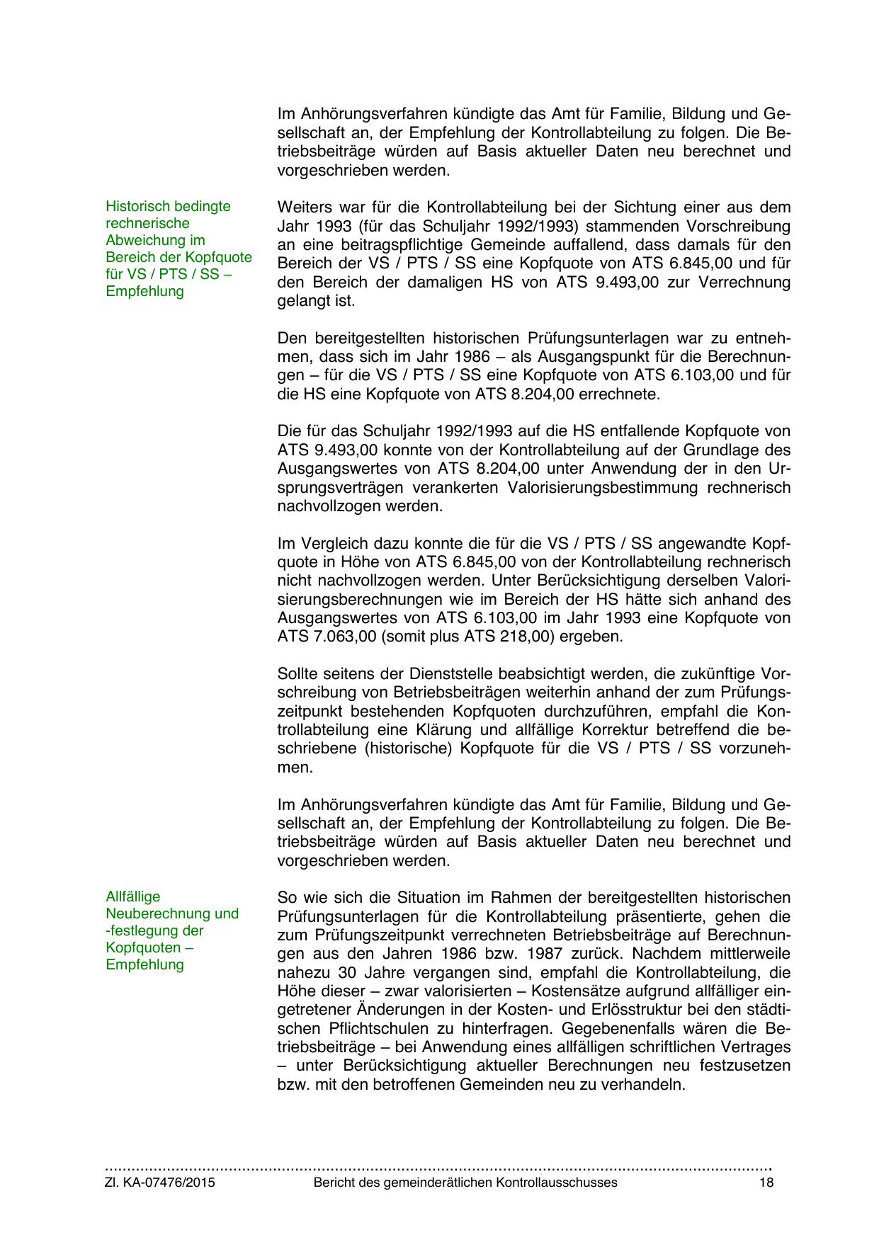 Im Vergleich dazu konnte die für die VS / PTS / SS angewandte Kopfquote in Höhe von ATS 6.845,00 von der Kontrollabteilung rechnerisch