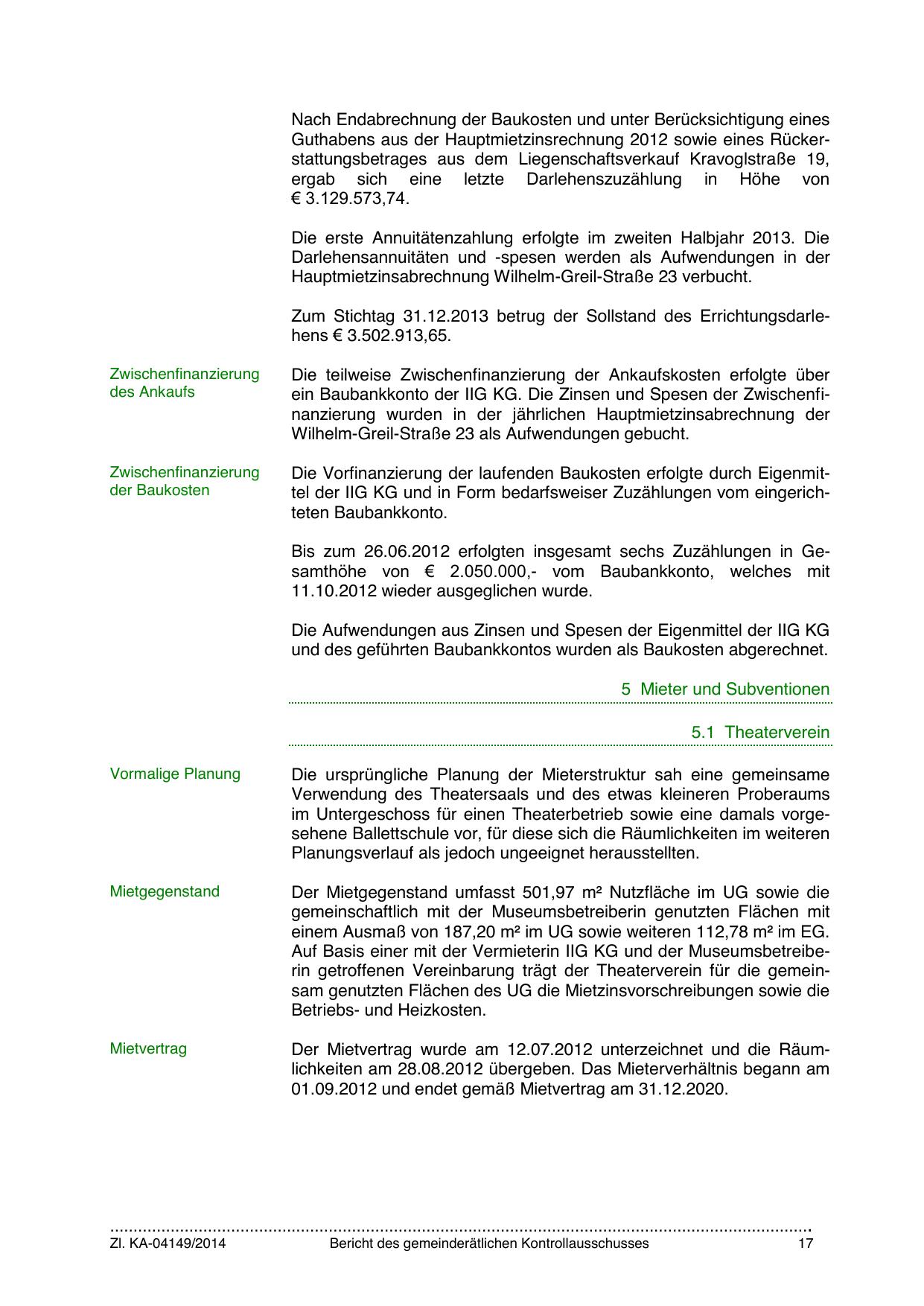 Auf Basis einer mit der Vermieterin IIG KG und der Museumsbetreiberin getroffenen Vereinbarung trägt der Theaterverein für die gemeinsam genutzten Flächen des UG die Mietzinsvorschreibungen sowie die
