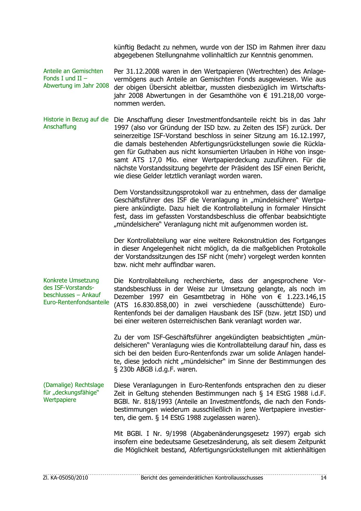 Geschäftsführer des ISF die Veranlagung in „mündelsichere“ Wertpapiere ankündigte. Dazu hielt die Kontrollabteilung in formaler Hinsicht