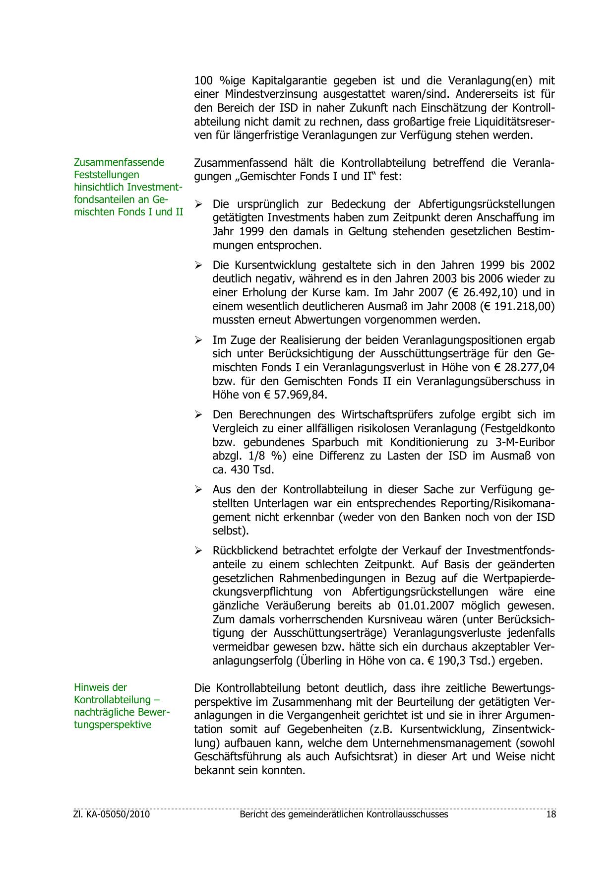 den Bereich der ISD in naher Zukunft nach Einschätzung der Kontrollabteilung nicht damit zu rechnen, dass großartige freie Liquiditätsreserven für längerfristige Veranlagungen zur Verfügung stehen werden.
