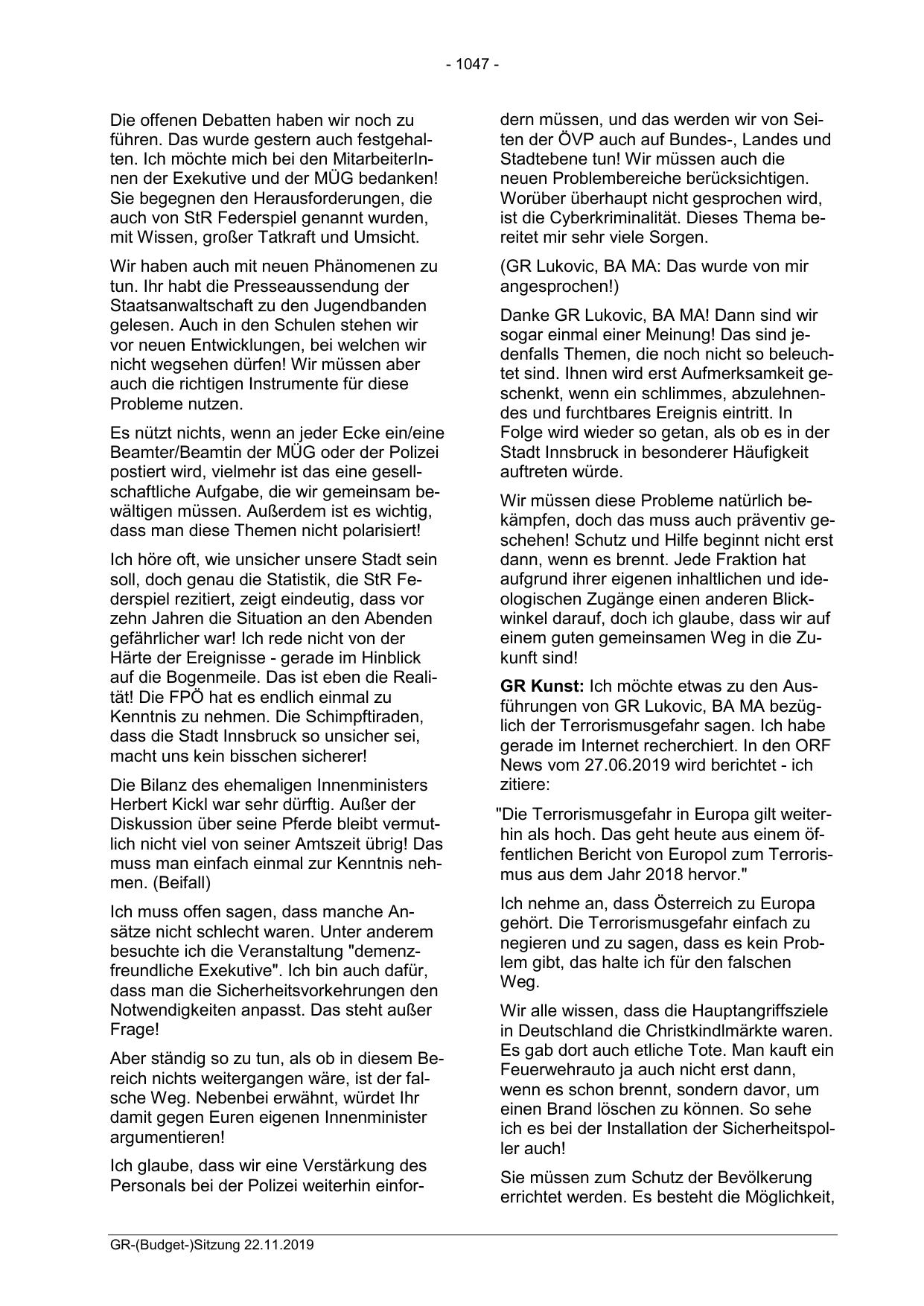 GR Kunst: Ich möchte etwas zu den Ausführungen von GR Lukovic, BA MA bezüglich der Terrorismusgefahr sagen. Ich habe