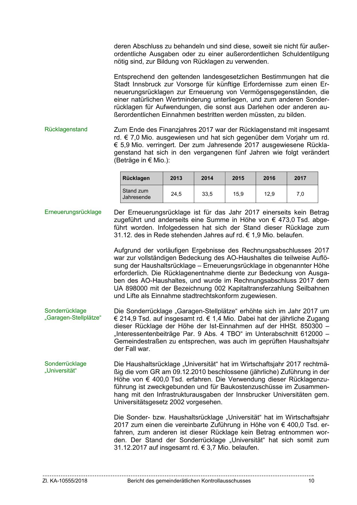 Stadt Innsbruck zur Vorsorge für künftige Erfordernisse zum einen Erneuerungsrücklagen zur Erneuerung von Vermögensgegenständen, die