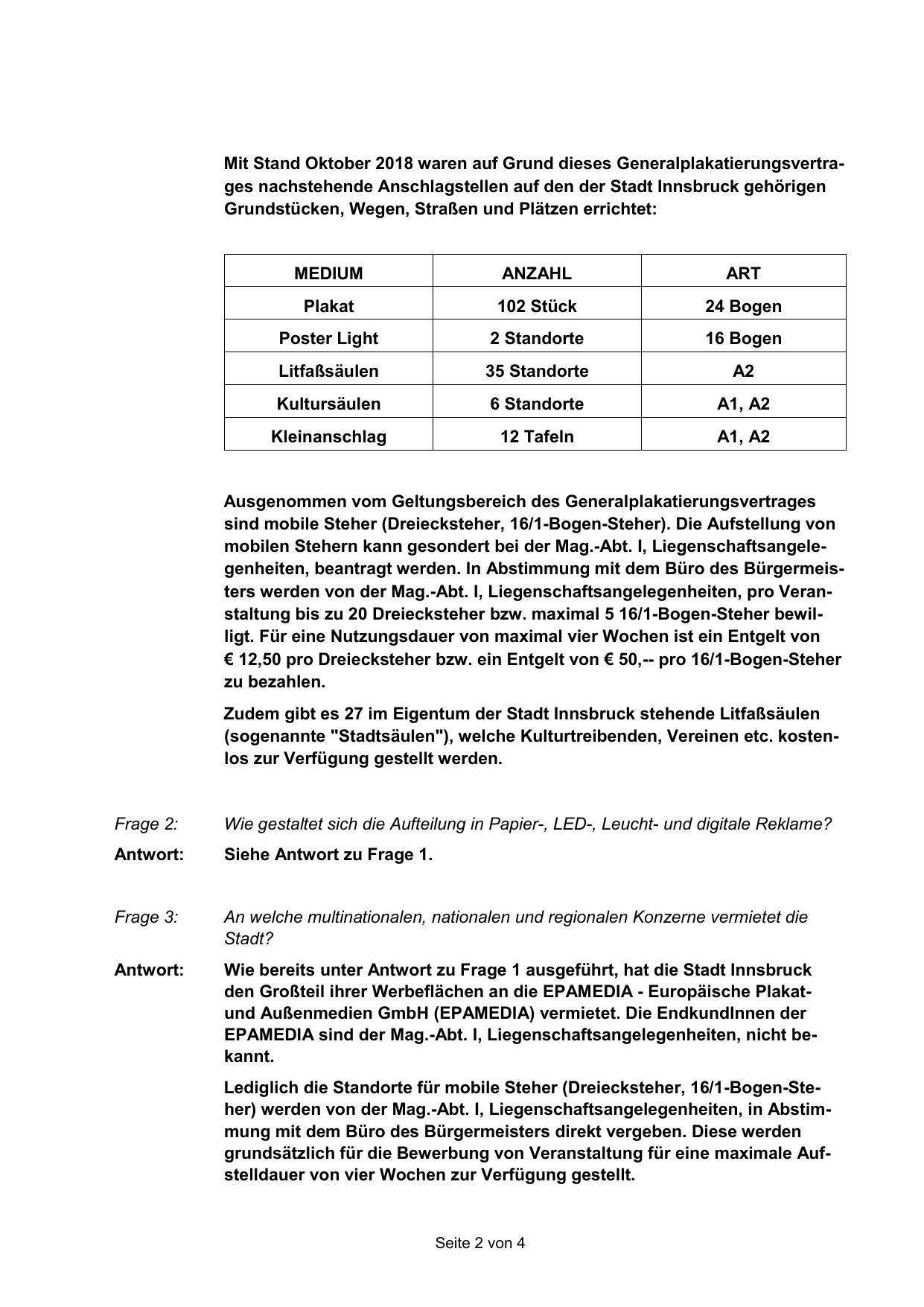 Mit Stand Oktober 2018 waren auf Grund dieses Generalplakatierungsvertrages nachstehende Anschlagstellen auf den der Stadt Innsbruck gehörigen