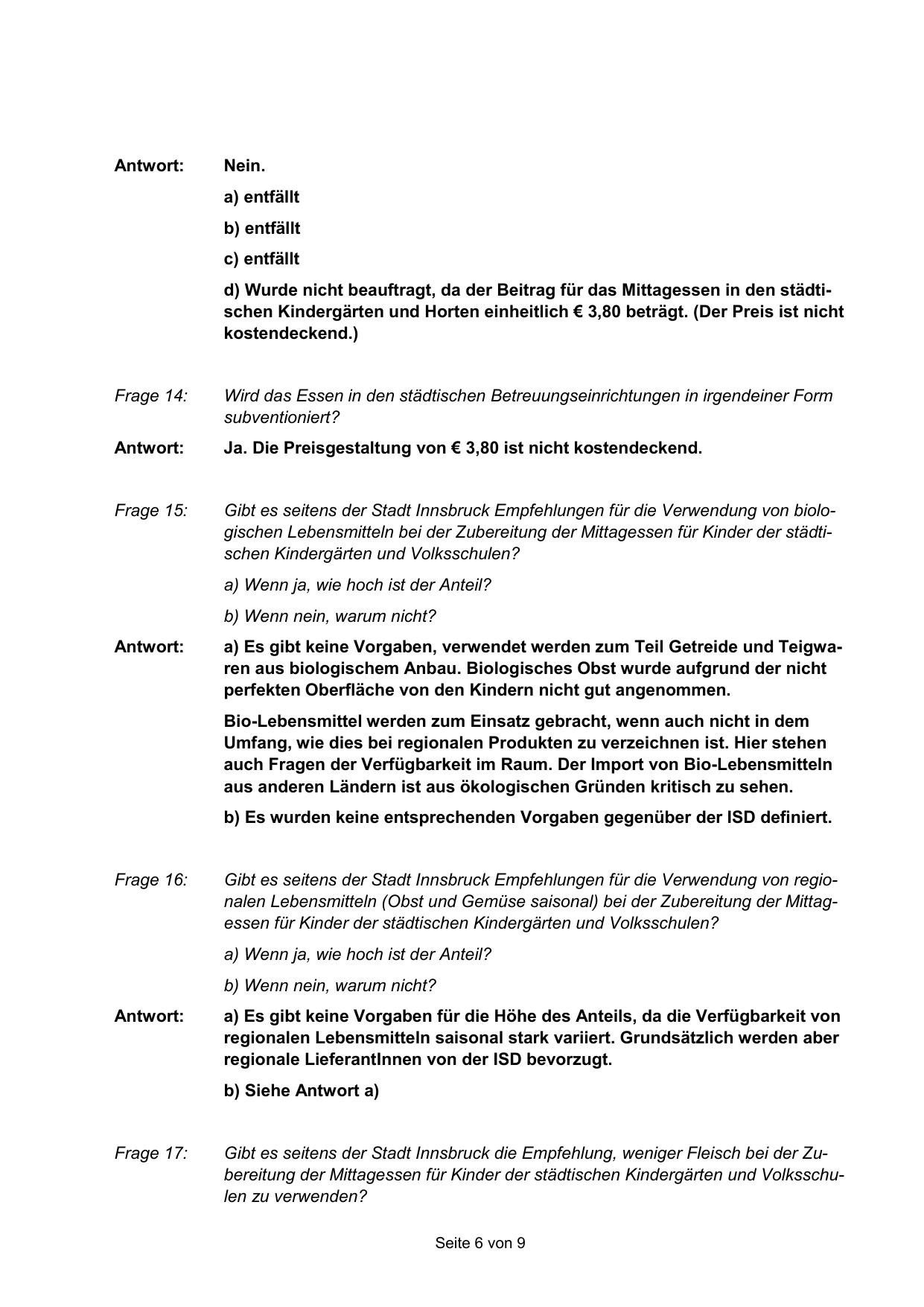 Gibt es seitens der Stadt Innsbruck Empfehlungen für die Verwendung von regionalen Lebensmitteln (Obst und Gemüse saisonal) bei der Zubereitung der Mittagessen für Kinder der städtischen Kindergärten und Volksschulen?