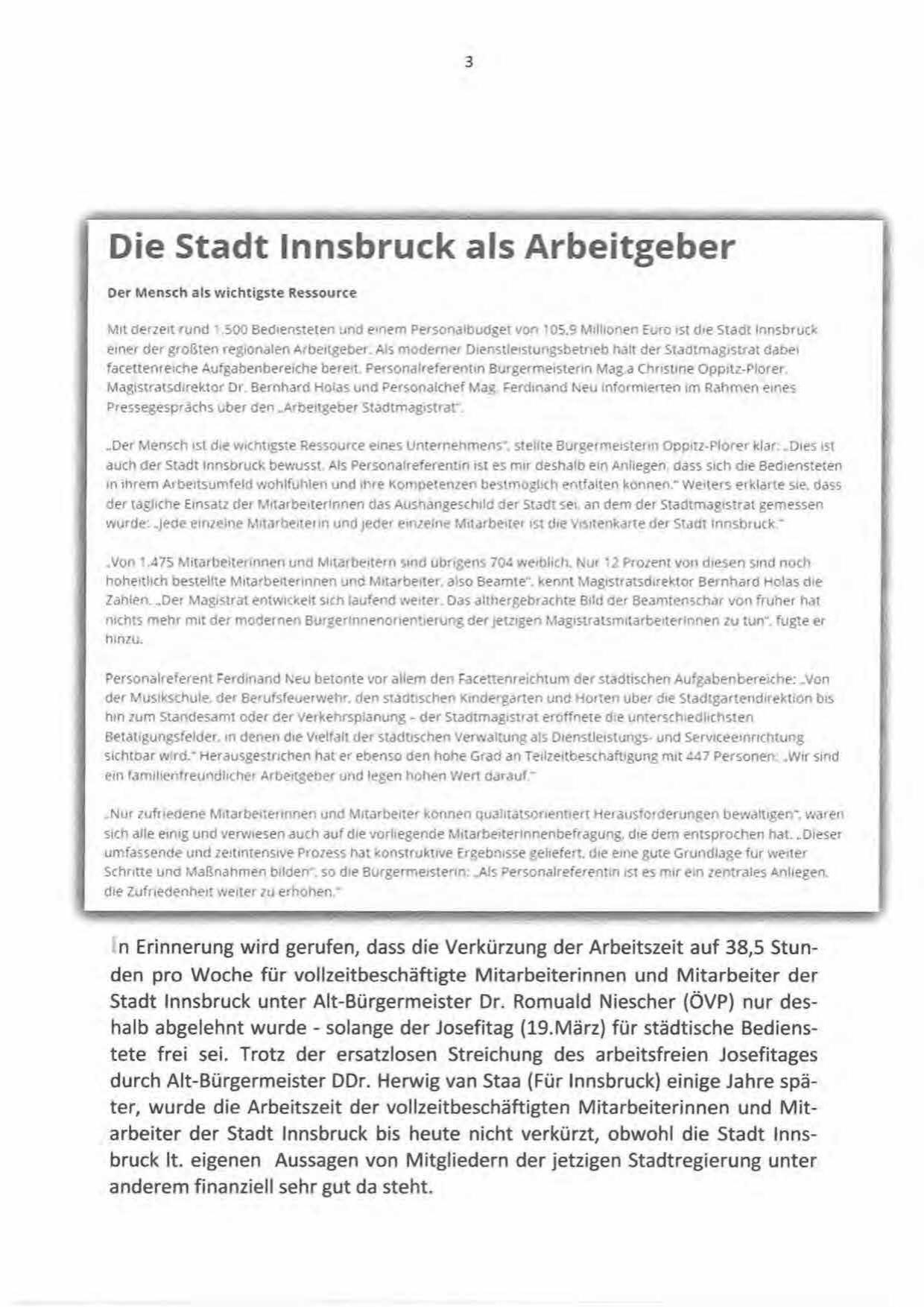 durch Alt-Bürgermeister DDr. Herwig van Staa (Für Innsbruck) einige Jahre später, wurde die Arbeitszeit der vollzeitbeschäftigten Mitarbeiterinnen und Mitarbeiter der Stadt Innsbruck bis heute nicht verkürzt, obwohl die Stadt Innsbruck lt. eigenen Aussagen von Mitgliedern der jetzigen Stadtregierung unter