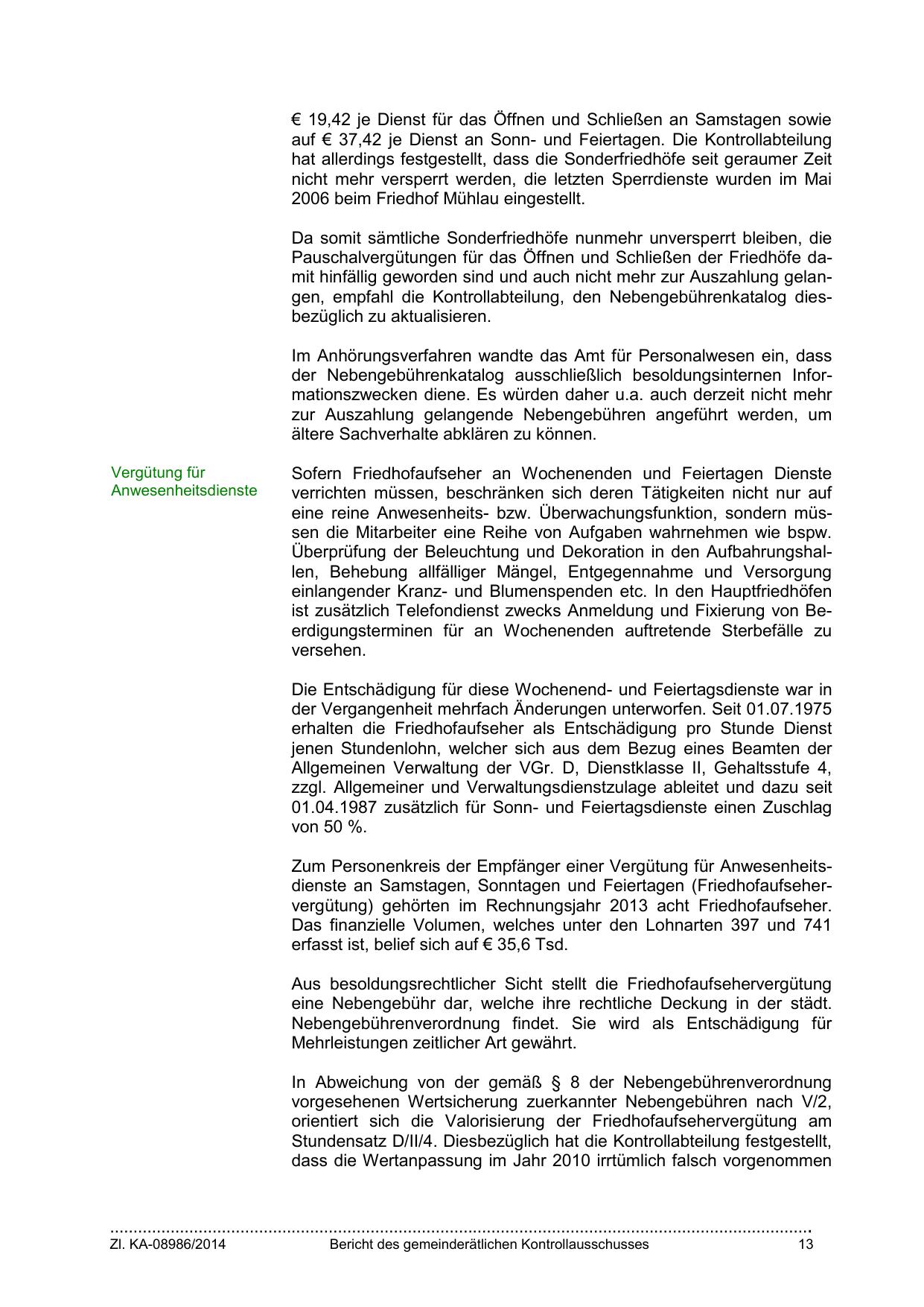 Zum Personenkreis der Empfänger einer Vergütung für Anwesenheitsdienste an Samstagen, Sonntagen und Feiertagen (Friedhofaufsehervergütung) gehörten im Rechnungsjahr 2013 acht Friedhofaufseher.