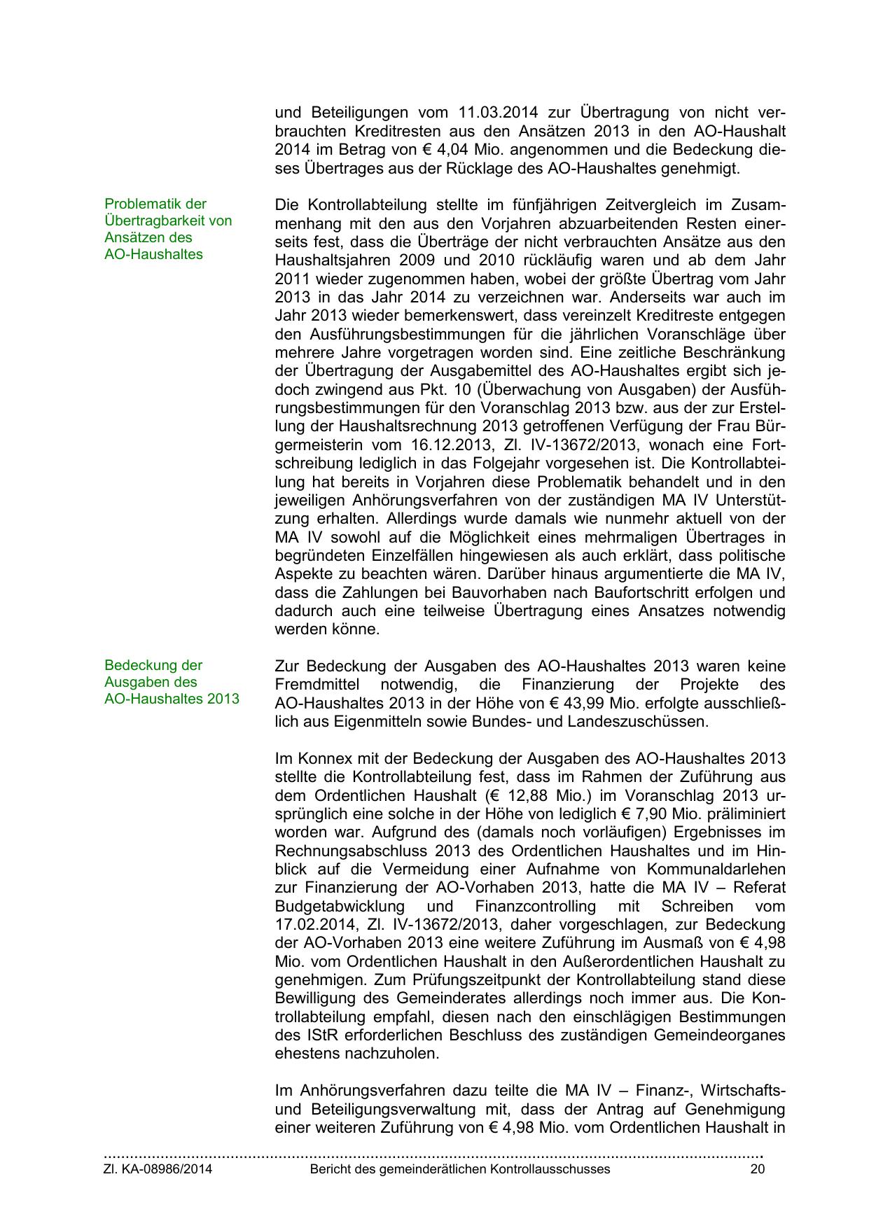 der Übertragung der Ausgabemittel des AO-Haushaltes ergibt sich jedoch zwingend aus Pkt. 10 (Überwachung von Ausgaben) der Ausführungsbestimmungen für den Voranschlag 2013 bzw. aus der zur Erstellung der Haushaltsrechnung 2013 getroffenen Verfügung der Frau Bürgermeisterin vom 16.12.2013, Zl. IV-13672/2013, wonach eine Fortschreibung lediglich in das Folgejahr vorgesehen ist. Die Kontrollabteilung hat bereits in Vorjahren diese Problematik behandelt und in den