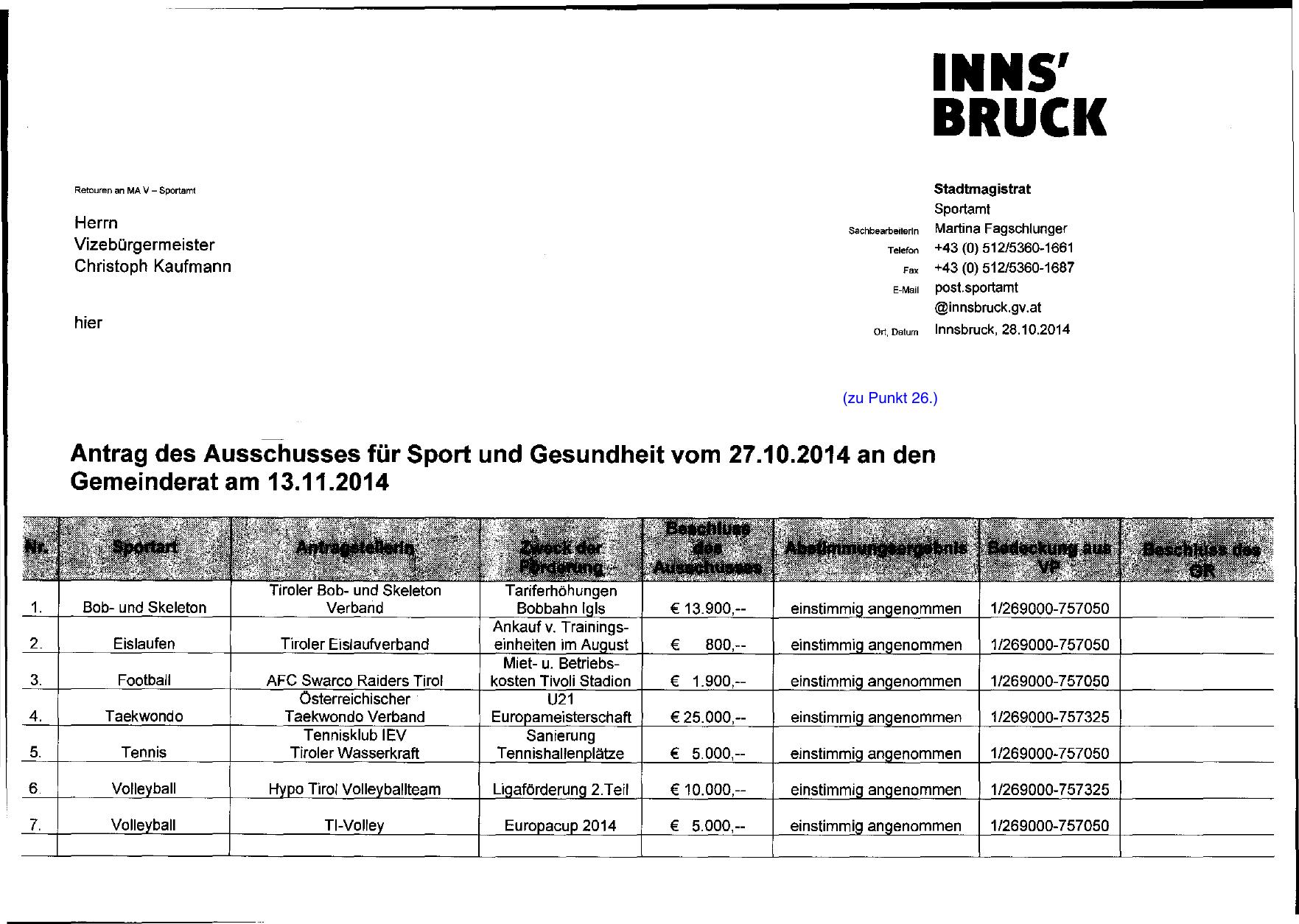 Retouren an MA V - Sportamt