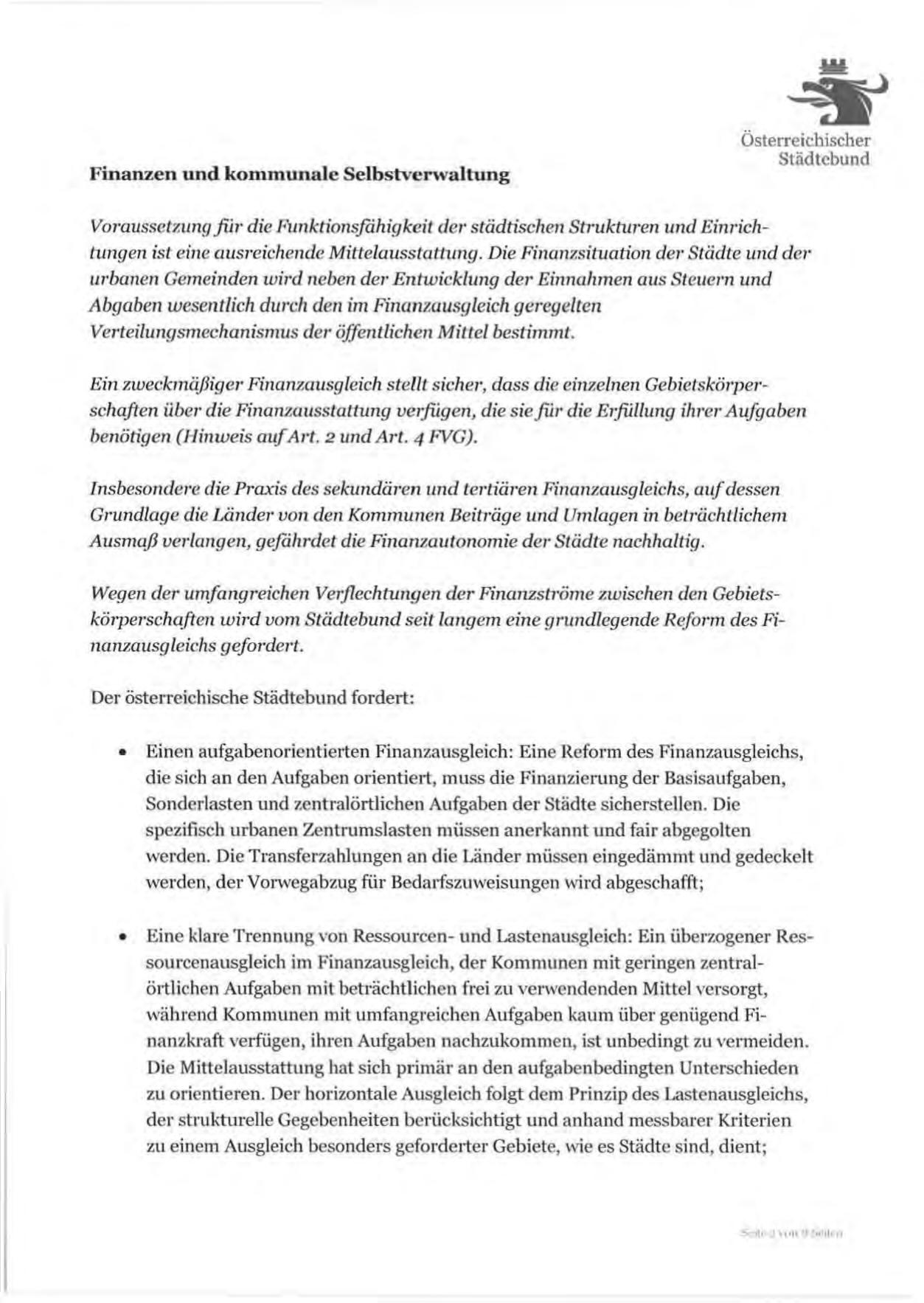 Wegen deI" umfarlgreichen Verjlechhmgen der" Final1zslröme zwischen den Gebietskör"per"schaflen wird vom Städtebund seit lang em eine grundlegende Re/orm des Finanzausgleichs ge/order"t.