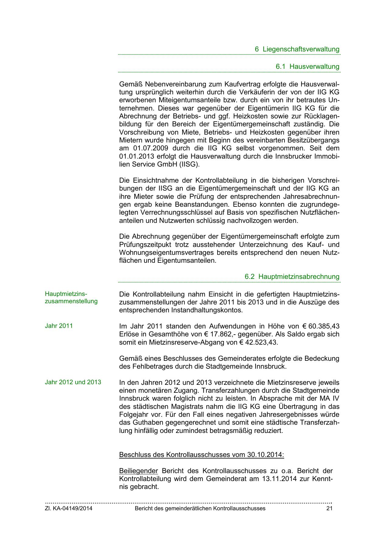 Die Kontrollabteilung nahm Einsicht in die gefertigten Hauptmietzinszusammenstellungen der Jahre 2011 bis 2013 und in die Auszüge des