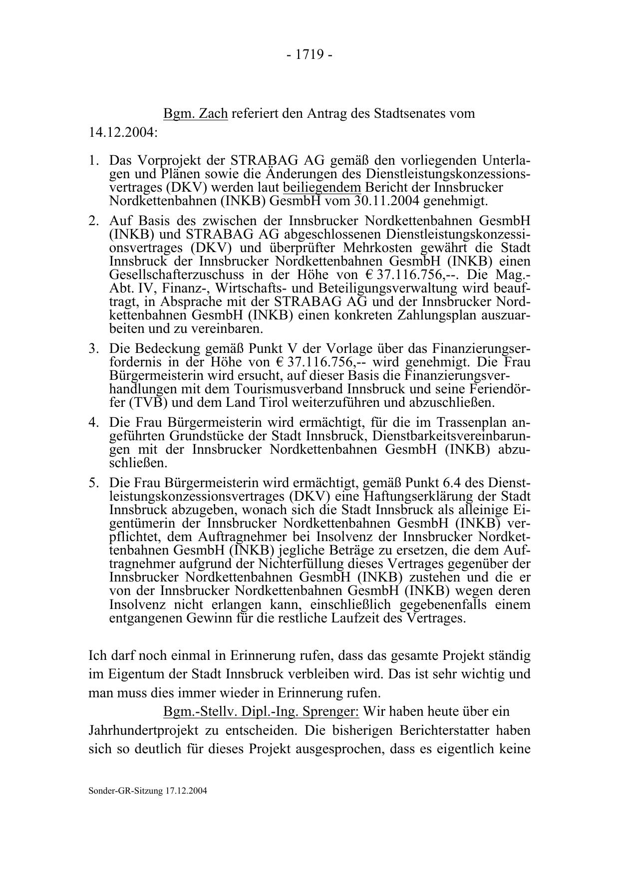 4. Die Frau Bürgermeisterin wird ermächtigt, für die im Trassenplan angeführten Grundstücke der Stadt Innsbruck, Dienstbarkeitsvereinbarungen mit der Innsbrucker Nordkettenbahnen GesmbH (INKB) abzuschließen.