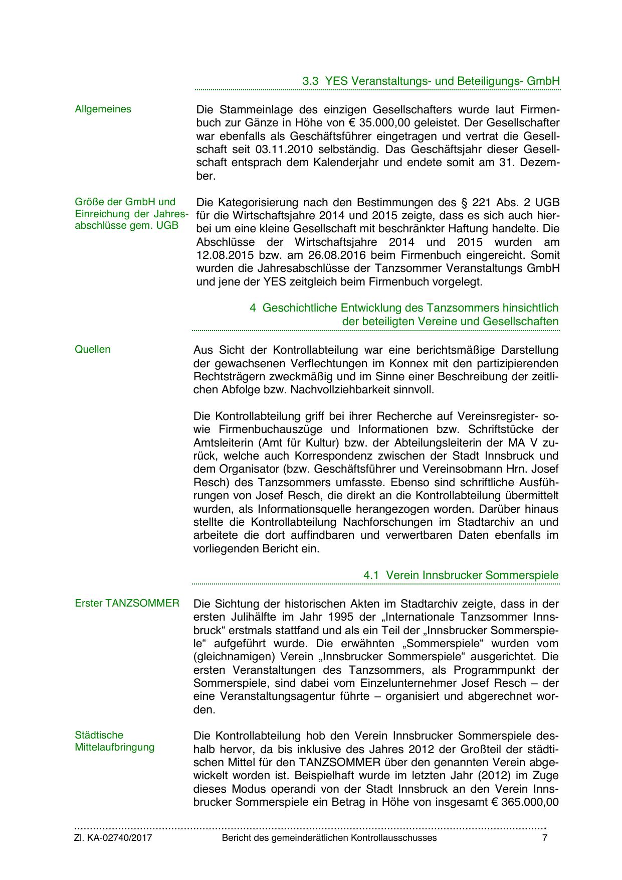 Die Kontrollabteilung hob den Verein Innsbrucker Sommerspiele deshalb hervor, da bis inklusive des Jahres 2012 der Großteil der städtischen Mittel für den TANZSOMMER über den genannten Verein abgewickelt worden ist. Beispielhaft wurde im letzten Jahr (2012) im Zuge