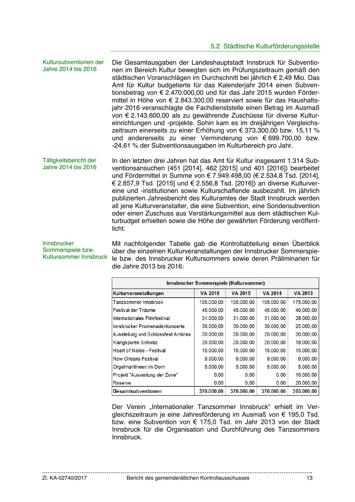 Amt für Kultur budgetierte für das Kalenderjahr 2014 einen Subventionsbetrag von € 2.470.000,00 und für das Jahr 2015 wurden Fördermittel in Höhe von € 2.843.300,00 reserviert sowie für das Haushaltsjahr 2016 veranschlagte die Fachdienststelle einen Betrag im Ausmaß