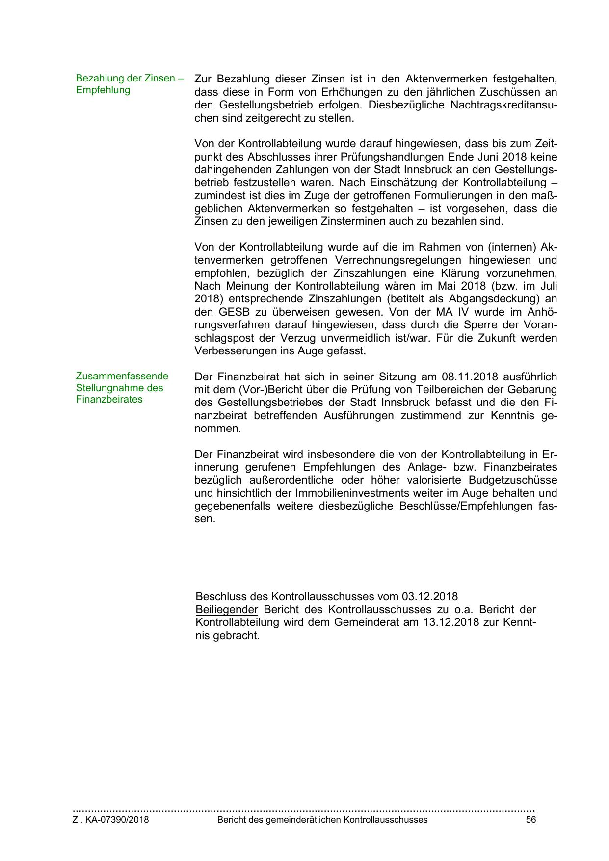 des Gestellungsbetriebes der Stadt Innsbruck befasst und die den Finanzbeirat betreffenden Ausführungen zustimmend zur Kenntnis genommen.