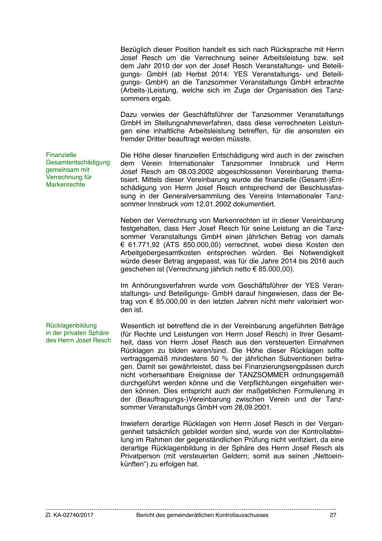 Josef Resch am 08.03.2002 abgeschlossenen Vereinbarung thematisiert. Mittels dieser Vereinbarung wurde die finanzielle (Gesamt-)Entschädigung von Herrn Josef Resch entsprechend der Beschlussfassung in der Generalversammlung des Vereins Internationaler Tanzsommer Innsbruck vom 12.01.2002 dokumentiert.