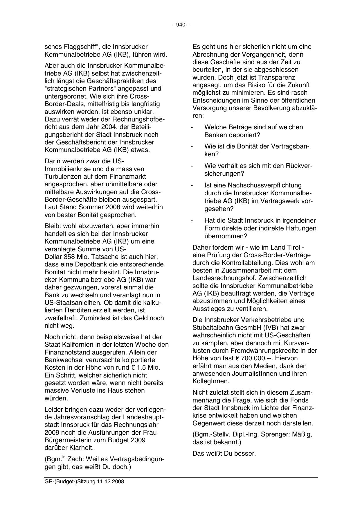 Leider bringen dazu weder der vorliegende Jahresvoranschlag der Landeshauptstadt Innsbruck für das Rechnungsjahr