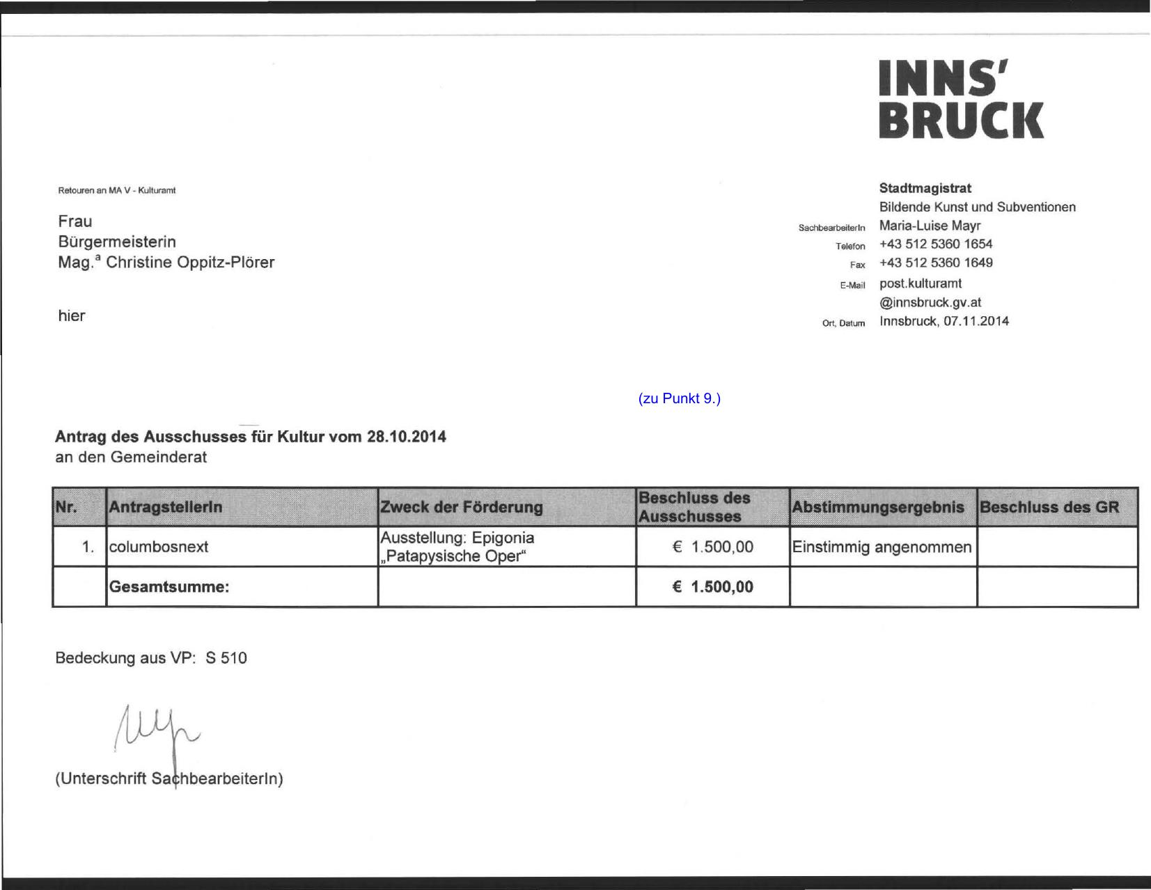 Antrag des Ausschusses für Kultur vom 28.10.2014