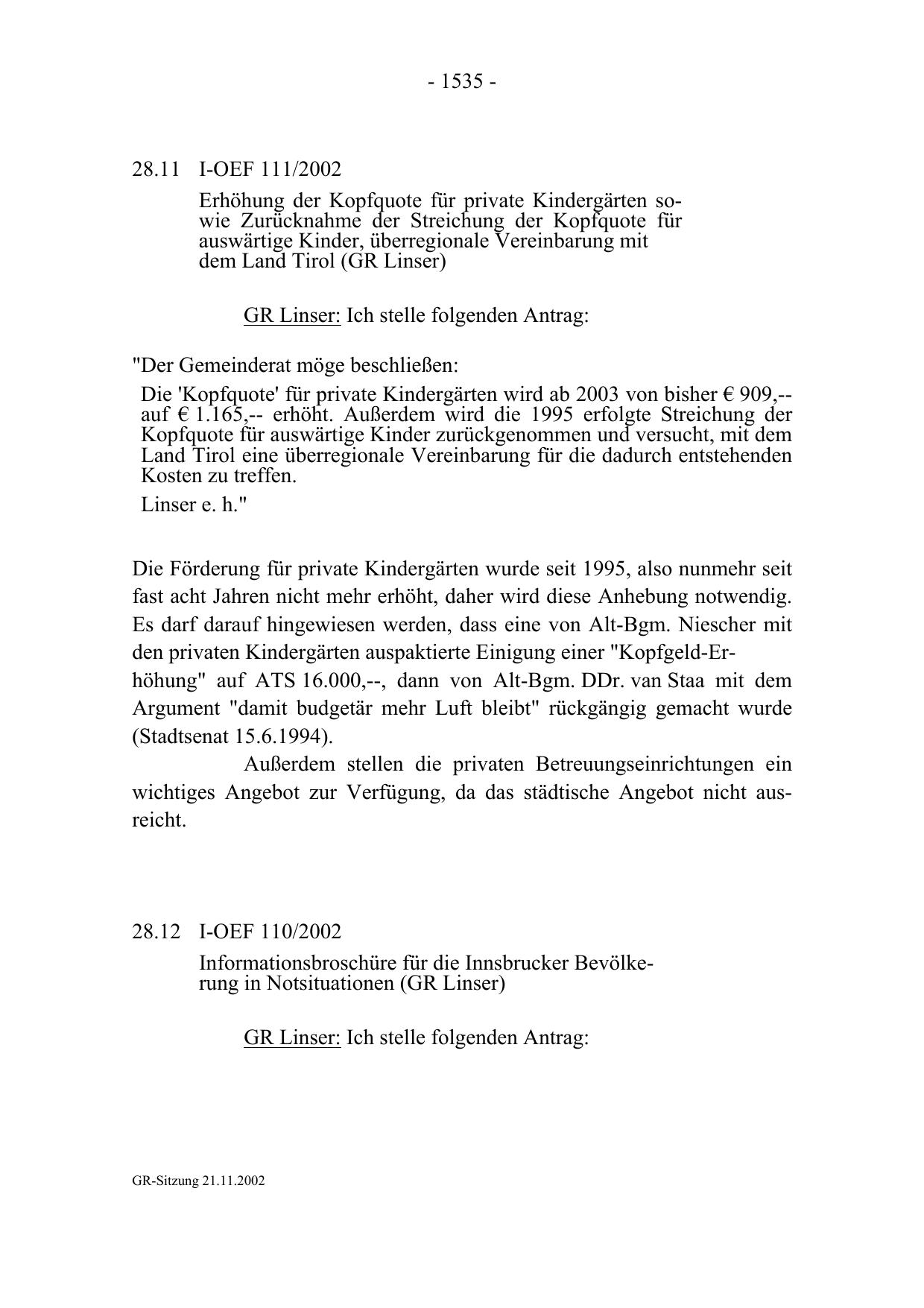 den privaten Kindergärten auspaktierte Einigung einer "Kopfgeld-Erhöhung" auf ATS 16.000,--, dann von Alt-Bgm. DDr. van Staa mit dem