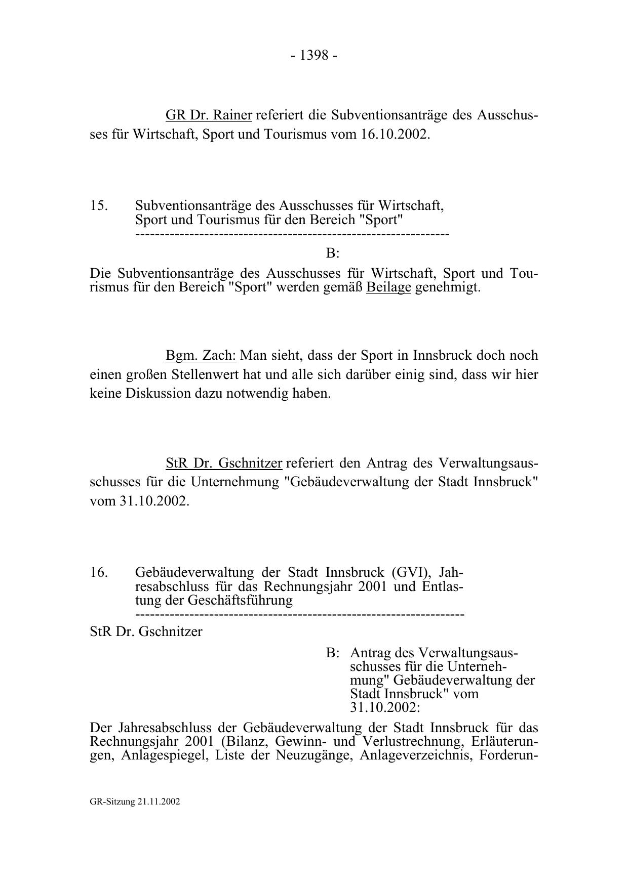 GR Dr. Rainer referiert die Subventionsanträge des Ausschusses für Wirtschaft, Sport und Tourismus vom 16.10.2002.
