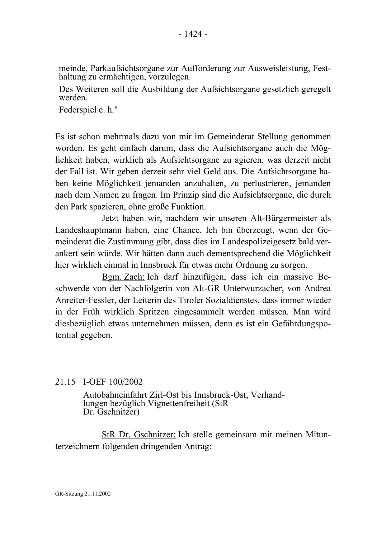 Bgm. Zach: Ich darf hinzufügen, dass ich ein massive Beschwerde von der Nachfolgerin von Alt-GR Unterwurzacher, von Andrea
