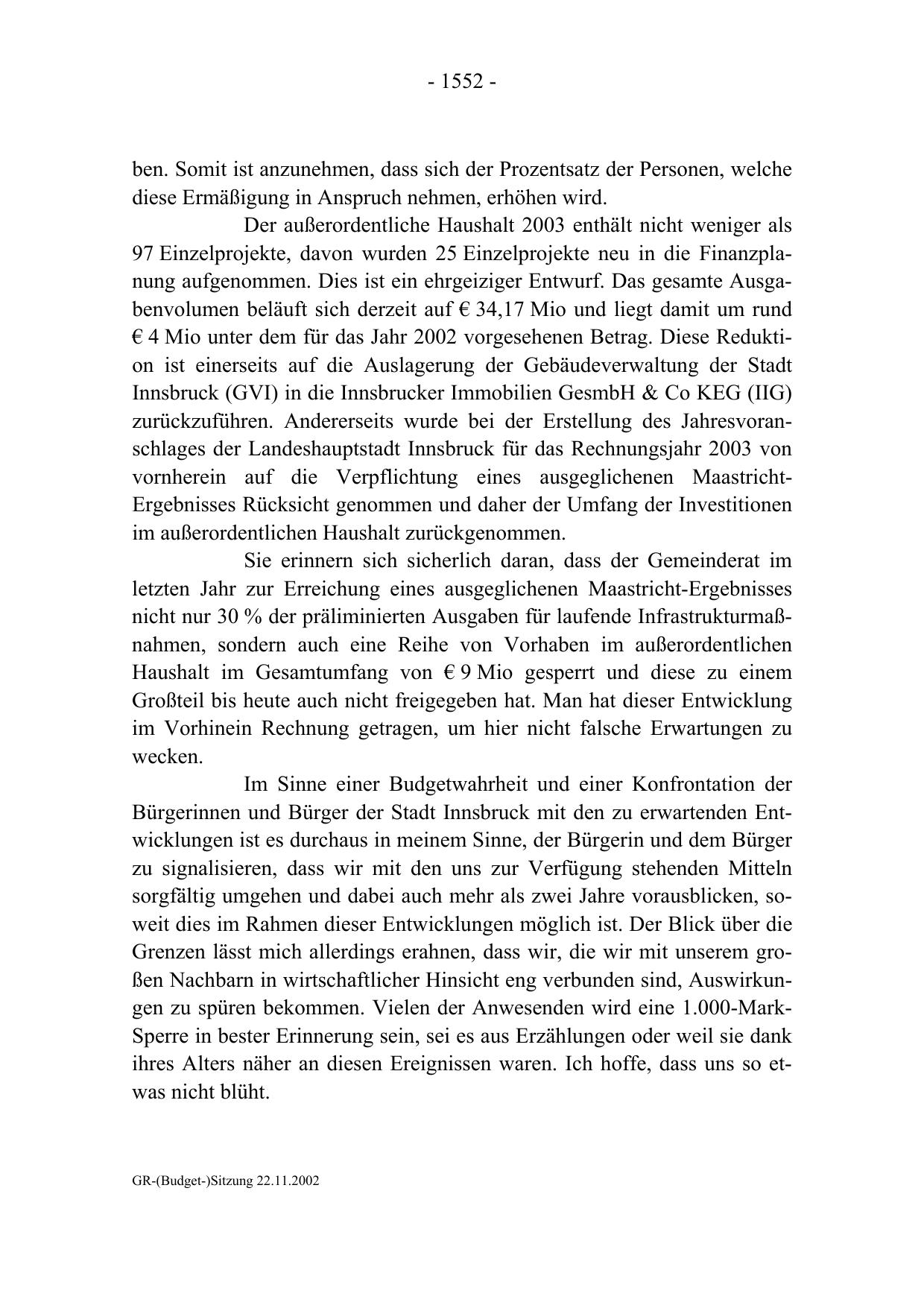 zurückzuführen. Andererseits wurde bei der Erstellung des Jahresvoranschlages der Landeshauptstadt Innsbruck für das Rechnungsjahr 2003 von