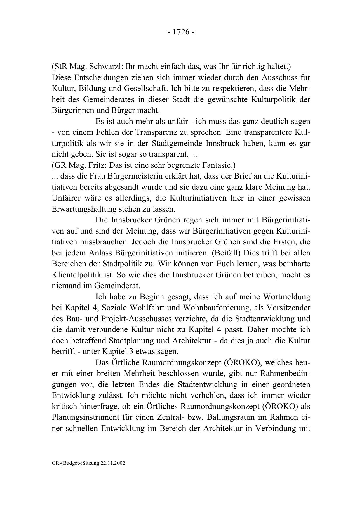 - von einem Fehlen der Transparenz zu sprechen. Eine transparentere Kulturpolitik als wir sie in der Stadtgemeinde Innsbruck haben, kann es gar
