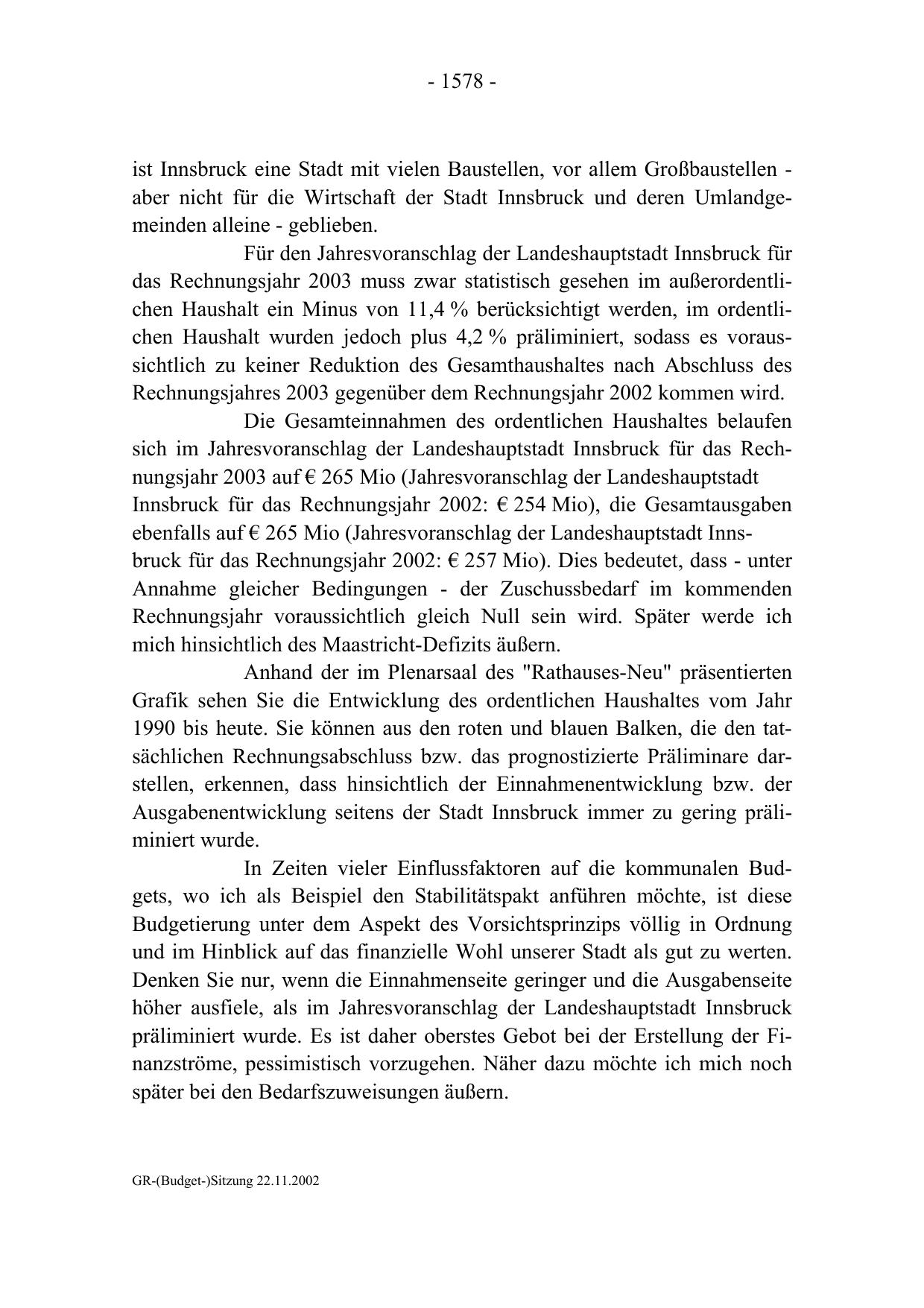 ebenfalls auf € 265 Mio (Jahresvoranschlag der Landeshauptstadt Innsbruck für das Rechnungsjahr 2002: € 257 Mio). Dies bedeutet, dass - unter